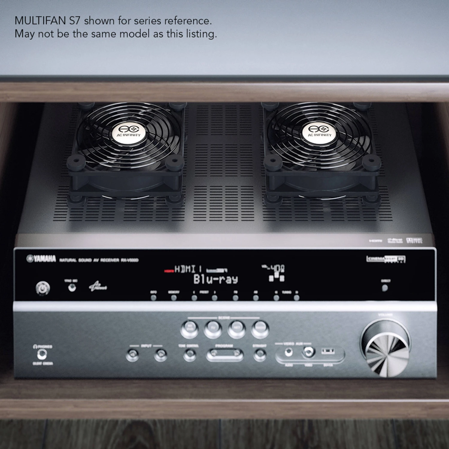 Cool your AV devices or game consoles with the Multifan S7 Dual USB Cooling Fans from AC Infinity. The Multifan S7 is equipped with two 120mm, 1300 rpm fans with dual-ball bearings, providing 104 CFM airflow while maintaining a low 19 dBA noise level. Add additional cooling by daisy-chaining up to four Multifan S-series fans. The fans are USB powered and can be set to the optimal airflow and noise levels for your environment with the included speed controller.