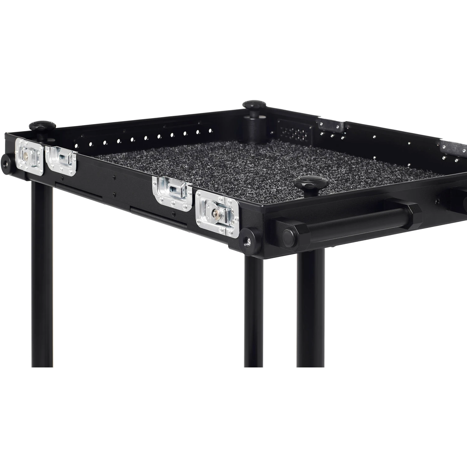 When working in tight spaces the adicam MINI Film Cart with Height Adjustable Legs is an ideal option for carrying just the gear you need. It can support up to 331 lb of equipment while still rolling smoothly on hard surfaces. The top shelf features a folding lip making it easier to slide equipment off the shelf, the lip locks into place when desired to prevent small parts from sliding off the shelf. Each shelf features a fabric facing to help prevent small items from rolling around or off the shelf, and the top shelf has an integrated plate with multiple 1/4″-20 and 3/8″-16 threaded holes. This cart features premium 10″ pneumatic wheels, two with wheel locks. Assembly takes only a few minutes, requiring no tools, and the assembled cart has a footprint of 24.8 x 33.9″ with an assembled height of 41.5″.