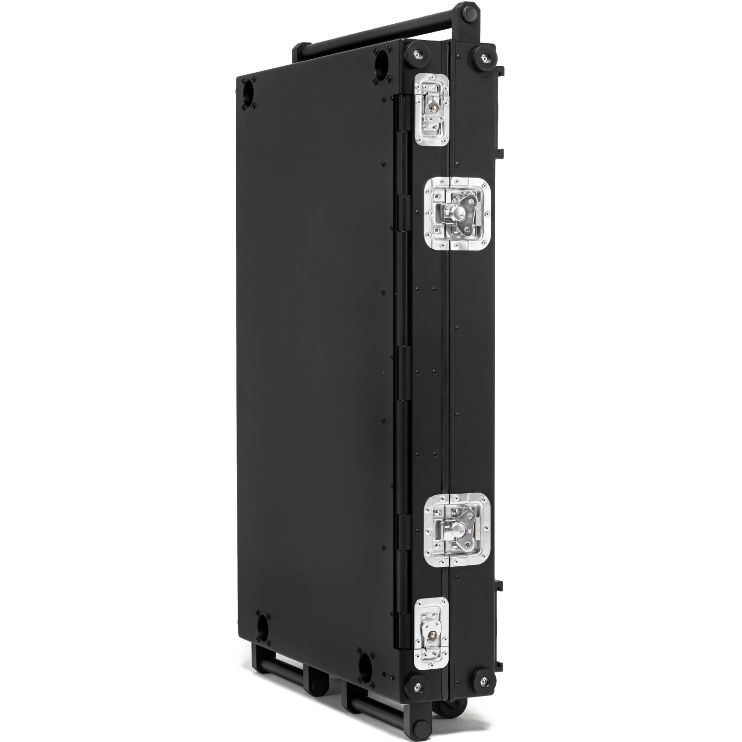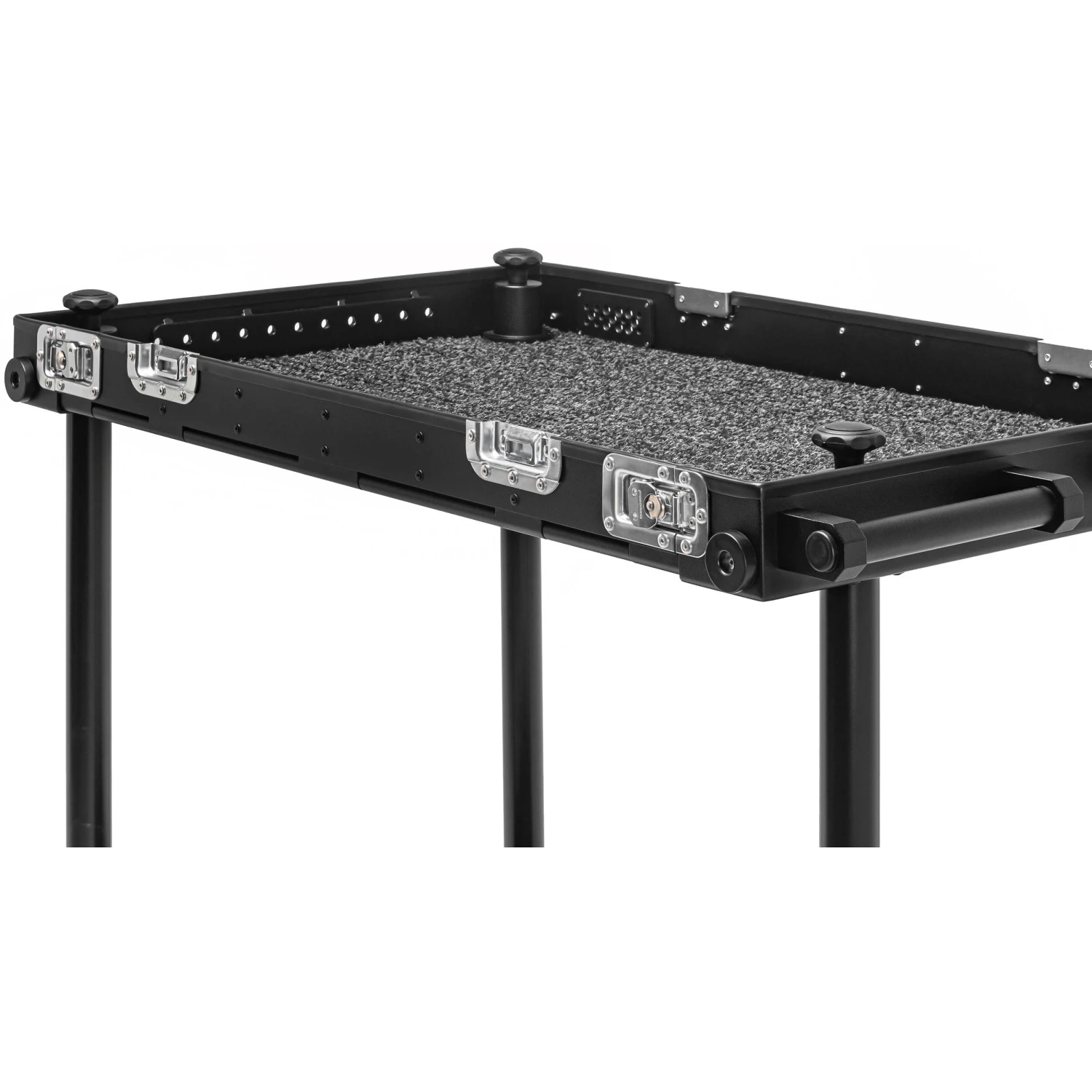 The reinforced adicam Standard+ Film Cart with Height Adjustable Legs can support up to 440 lb of equipment while still rolling smoothly on hard surfaces. The cart components fit into the base/bottom shelf, holding the 9″ pneumatic wheels and riser tubes, and the top flips over and then locks using the silver latches. The top shelf features a folding lip making it easier to slide equipment off the shelf, the lip locks into place when desired to prevent small parts from sliding off the shelf. Each shelf features a fabric facing to help prevent small items from rolling around or off the shelf, and the top shelf has an integrated plate with multiple 1/4″-20 and 3/8″-16 threaded holes. Integrated wheels help you roll the folded cart for transport when not in use. Assembly takes only a few minutes, requiring no tools, and the Assembled cart has a footprint of 24.8 x 41.1″ with an assembled height range of 34.4 to 42.3″.