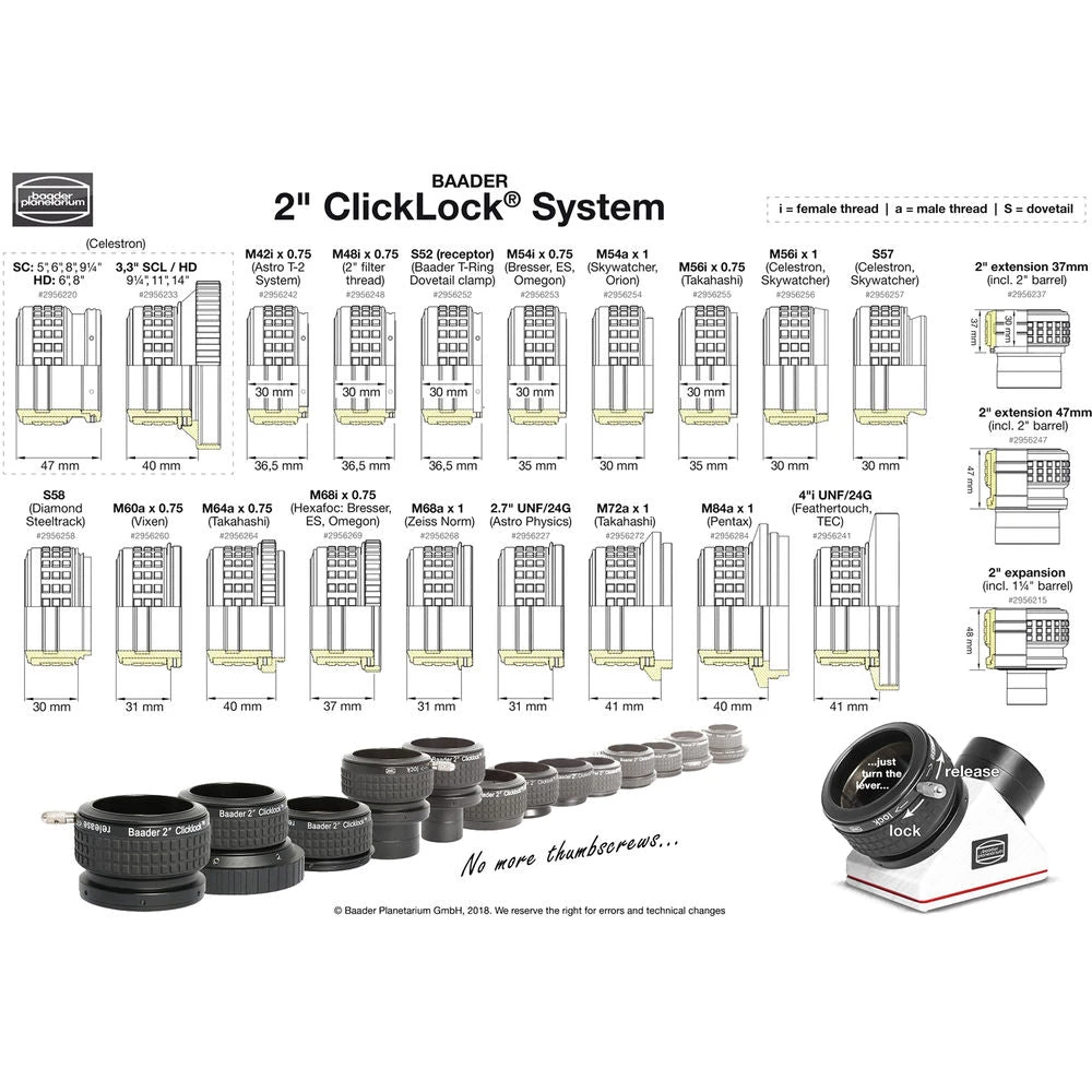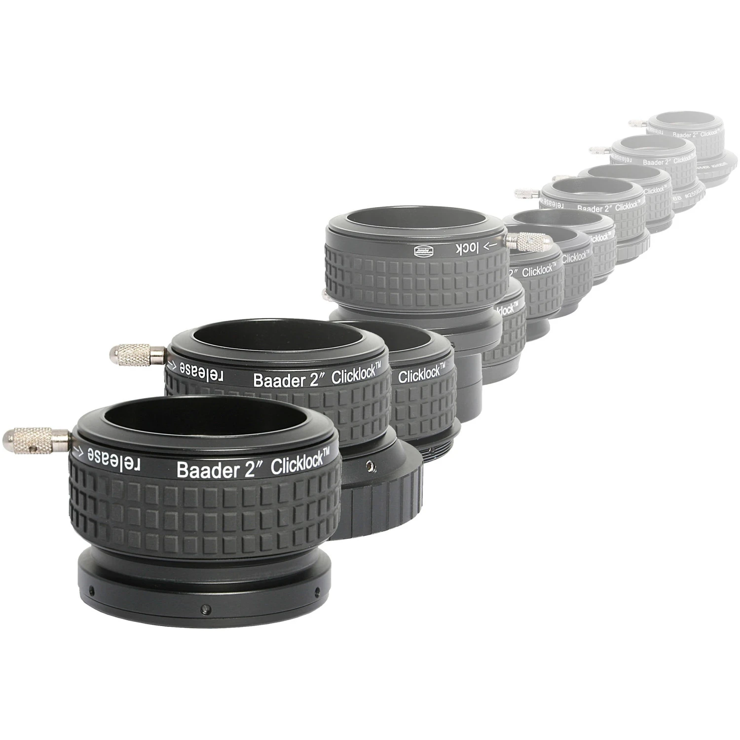 The Alpine Astronomical Baader 1.25″ to 2″ ClickLock Expansion Adapter allows you to use larger 2″ eyepieces in the more common 1.25″ size holders. It has a standard 1.25″ nosepiece, with a 2″ ClickLock holder on the other side. This unique eyepiece mounting system is superior to conventional mountings. Unlike compression ring and set screw holders, the ClickLock system uses three long roller bearings to hold the eyepiece firmly centered in place without marking or marring it, while eliminating wobble and off-axis tilt that may occur with ring & screw systems. A simple 20° twist locks and releases the clamping system for fast eyepiece changes even while wearing gloves. There is no need to fumble with small set screws or for using excessive force and torque to hold the eyepiece in a fixed position.