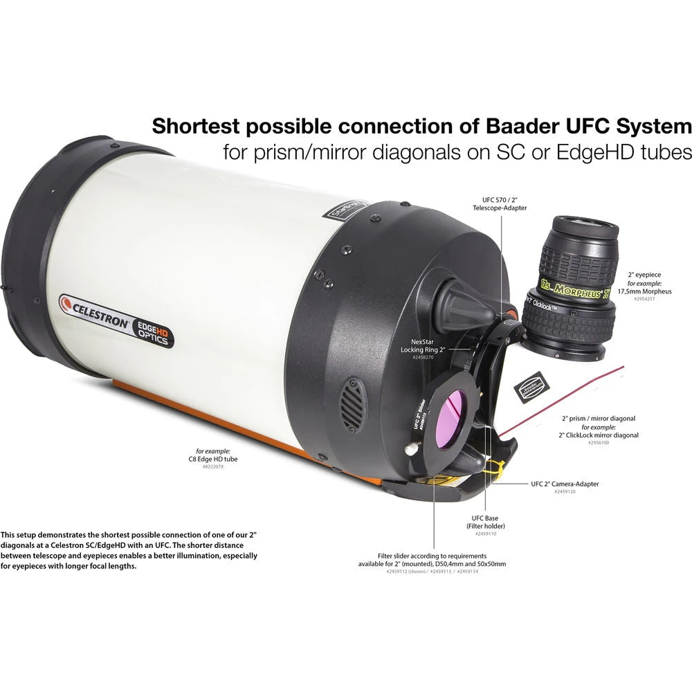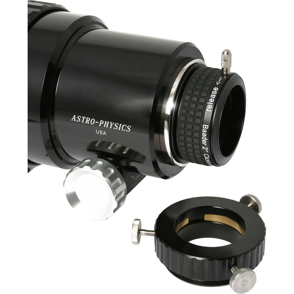 The 1.25″ nosepiece may be removed to expose an internal T-2 photo thread, enabling connection to other Baader Astro T-2 accessories. Also, the T-2 threaded ring may be removed to expose a 2″ Schmidt-Cassegrain telescope (SCT) thread.