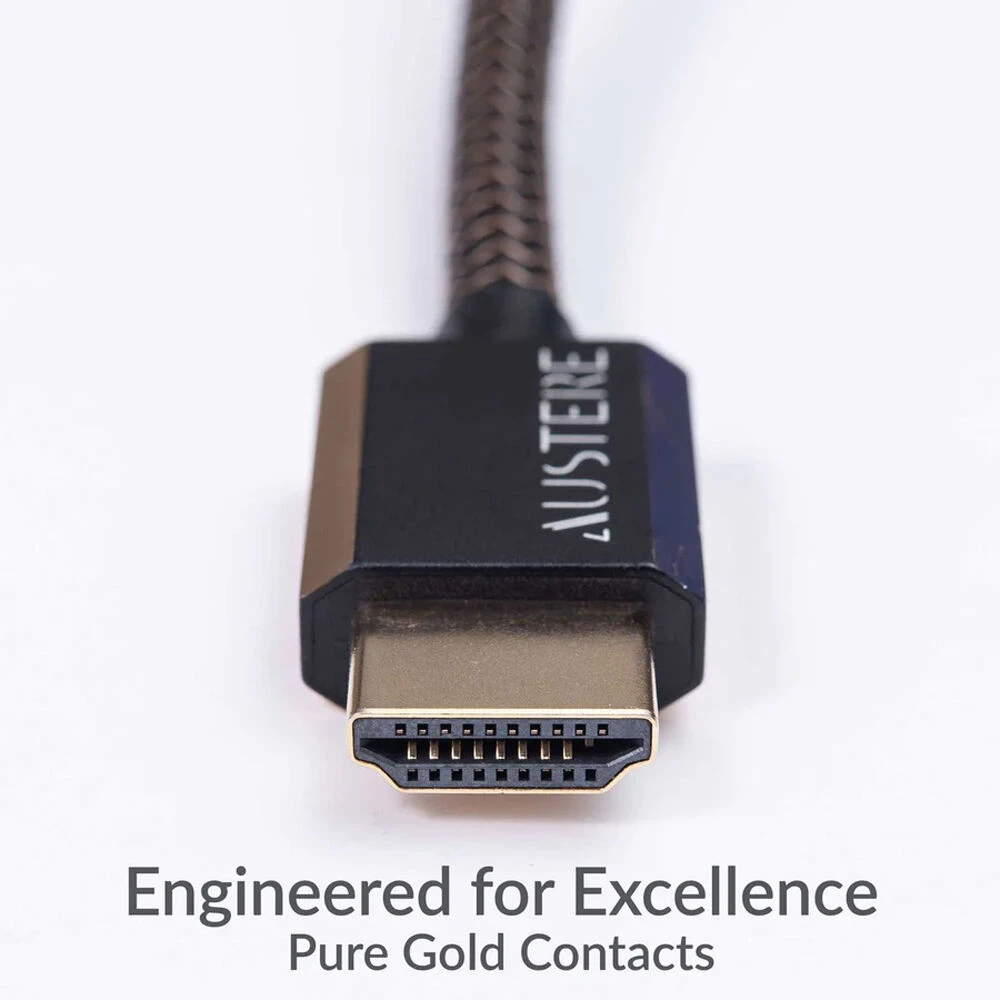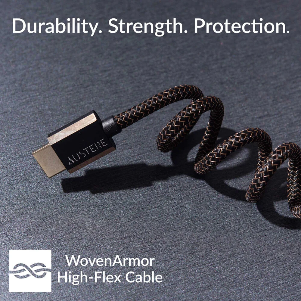 The 8.2′ Austere III Series 4K HDMI Cable is a premium cable certified to deliver 18 Gb/s and 4K60 video. Wrapped in Austere’s proprietary WovenArmor jacket, this cable is constructed for strength and flexibility. The Austere III Series cable is ARC compatible for seamless connection between your TV and any ARC-equipped AV device. The pure gold contacts and oxygen-free copper enable a long life of peak performance.