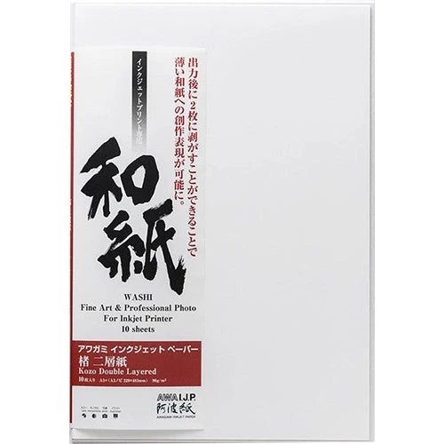 Create visually distinct prints with this 10-pack of 13 x 19″ Kozo Natural Double-Layered Inkjet Paper from Awagami Factory. Featuring a basis weight of 96 gsm, and a peel-away back sheet, this paper’s printable side is composed of 100% kozo fiber. The back peel-away sheet is made from wood pulp and discarded after peeling apart the print, and the remaining printed sheet will be approximately 1/3 third the original thickness. A very unique sheet, this paper is typically used for fine art, backlit photography, reproduction of fine art prints, scrolls and antique replicas.