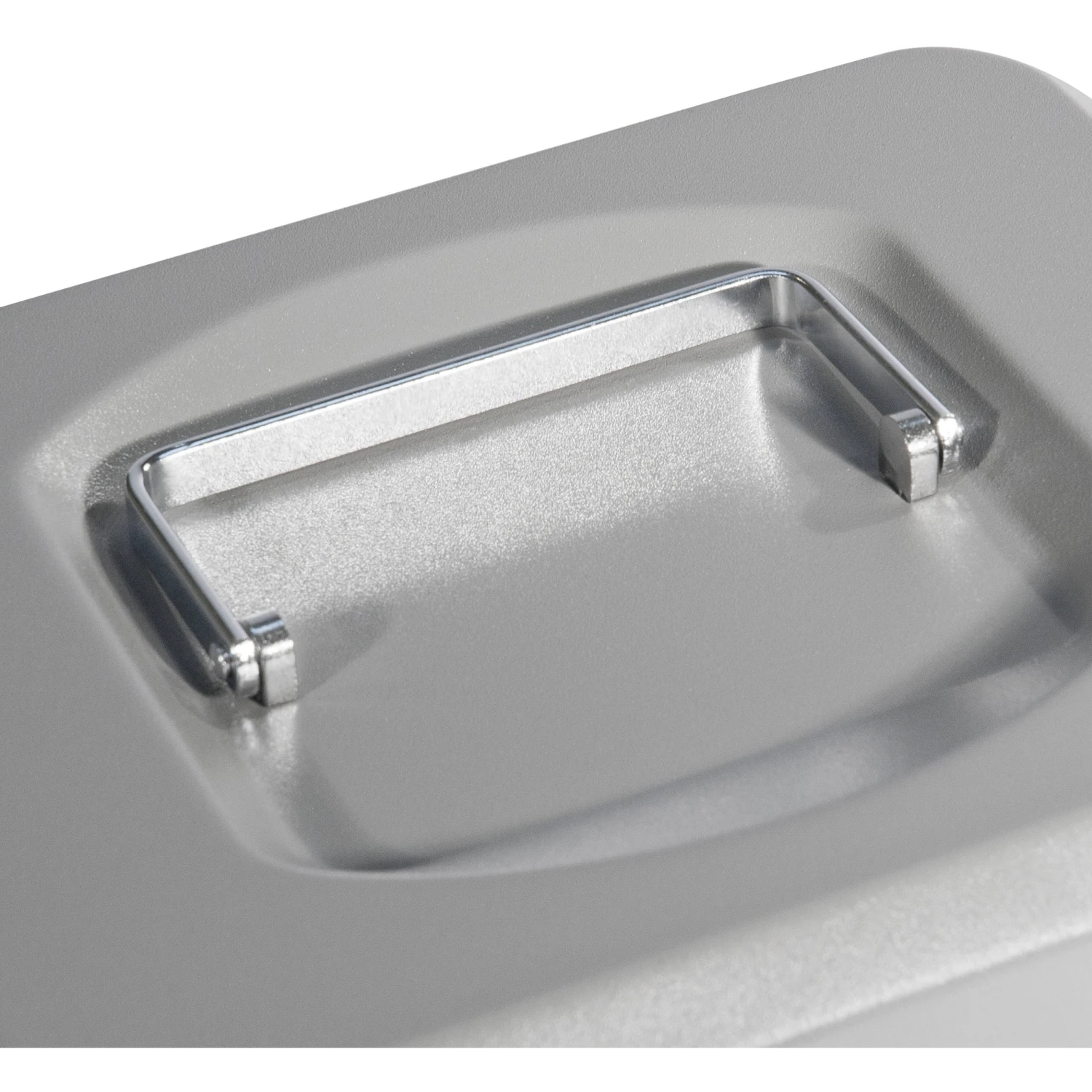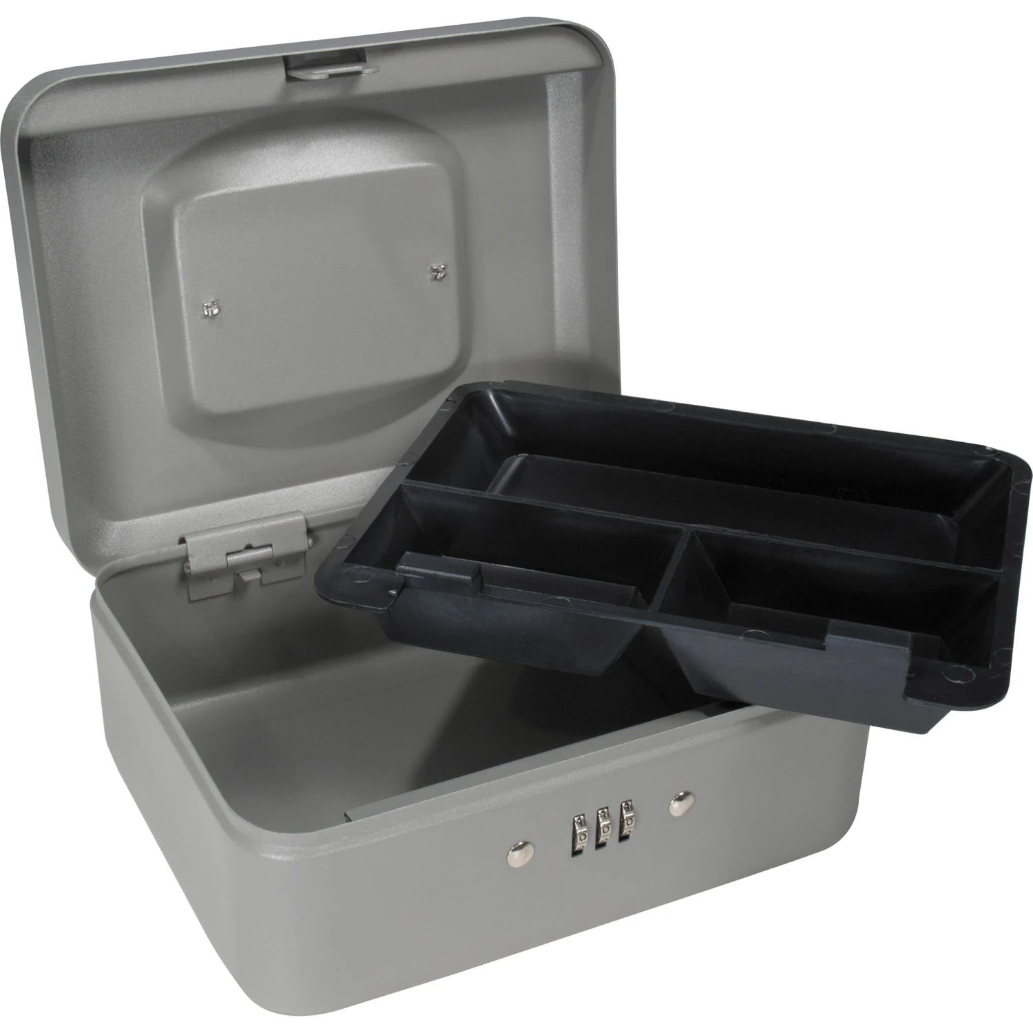 The gray 8″ Cash Box with Combination Lock from Barska is a three compartment locking box designed for storing cash, coins, checks, and other valuables. This compact cash box has 0.8mm thick steel walls, three removable tray compartments, and a resettable three-number combination locking mechanism.