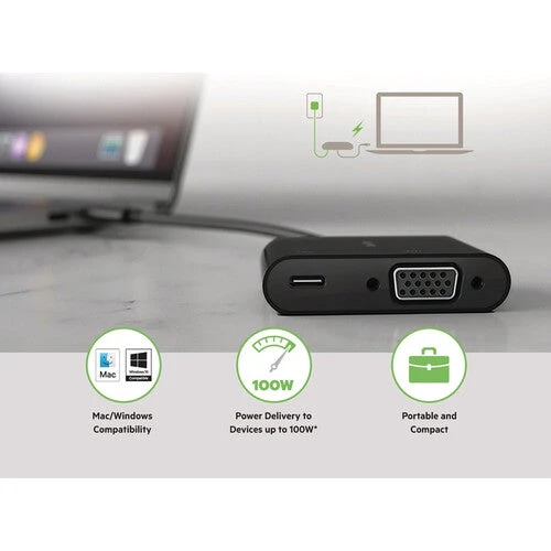 Have the versatility to connect multiple monitor types to your USB Type-C-compatible laptop with the USB Type-C to DisplayPort, HDMI, VGA, and DVI Adapter from Belkin . This portable video adapter plugs into your system and works without needing additional drivers or an external power source. Connect compatible external monitors with up to 4K resolution to the respective DisplayPort, HDMI, VGA, or DVI port to increase your viewing space, multitask more efficiently, deliver presentations, and more. Its compact size allows it to be easily stored in a bag or backpack for travel.