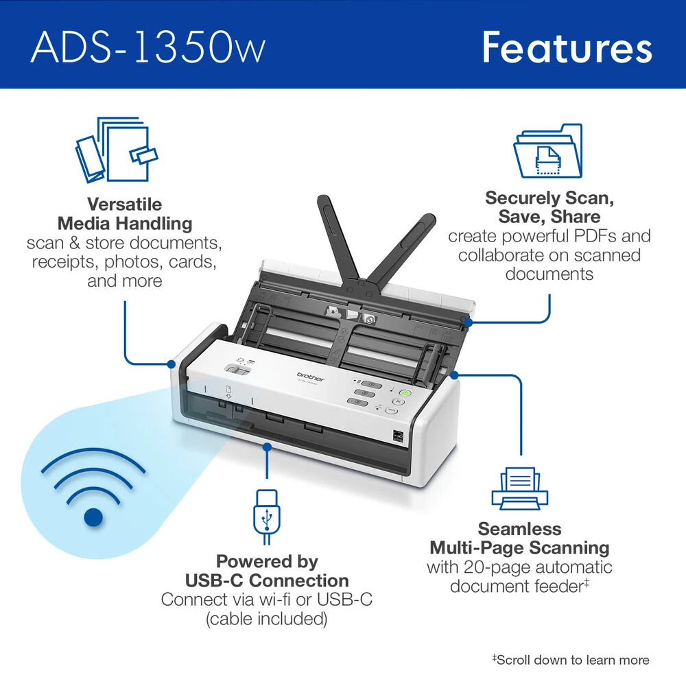 - Brother ADS-1350W Wireless Portable Document Scanner