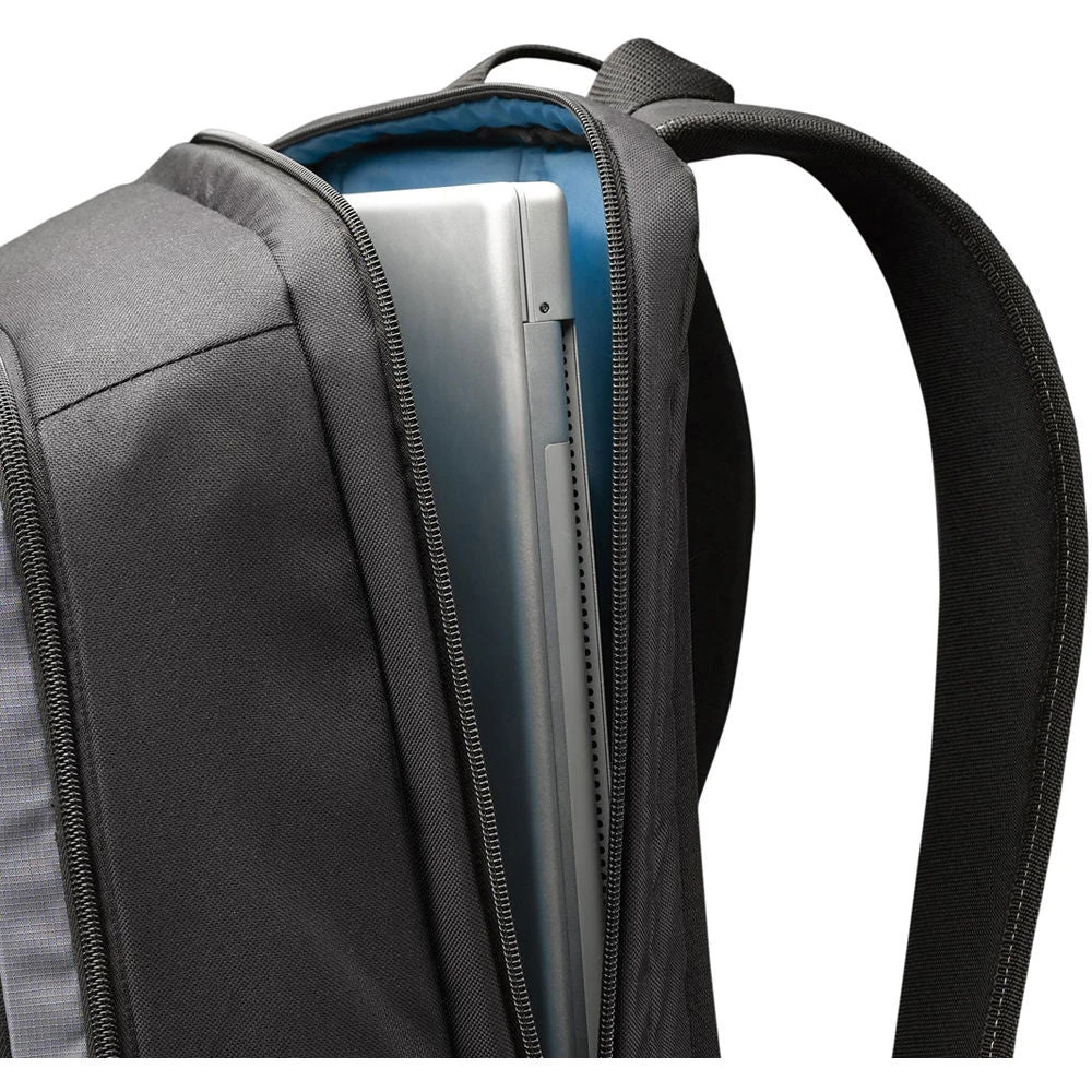 The 17″ Laptop Backpack from Case Logic has a dedicated 3/4 zippered laptop compartment. There’s an additional zippered storage compartment for books, files, folders and other collateral material. A front zippered organizer panel is for your small items. In front of the organizer is a vertical zippered Speed Pocket for your valuables (watch, keys, phone) that will make it easier to go through airport security. There’s a mesh water bottle pocket on the side of the pack. The 17″ Laptop Backpack is made from Dobby (woven) nylon. It’s carried by adjustable pack straps or its top grab handle.