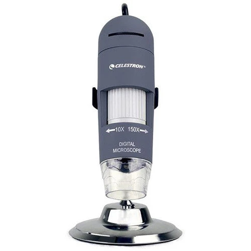 Explore the microverse with the Celestron 44302-C Deluxe Handheld Digital Microscope . This compact and lightweight handheld magnification tool can also be placed on the included metal stand and be configured to point in any desired direction. The permanently attached USB 2.0 cable connects it to your PC or Mac so you, your kids, or your students can use this handy microscope for a wide variety of home, laboratory, or field observations�including capturing hi-res still images and video from biological specimens, electronic devices, and precious materials and stones. The optical system features a 2.0MP imaging sensor and an eight-LED illumination ring, a 10-200x magnification range, and a coarse focusing ring. The polycarbonate body is compact, lightweight, and ergonomic. It features a transparent polymer bezel to protect the lens and the LEDs from dust and damage and a push summary on the tailcap to capture data. Also included in the package is a CD with software.