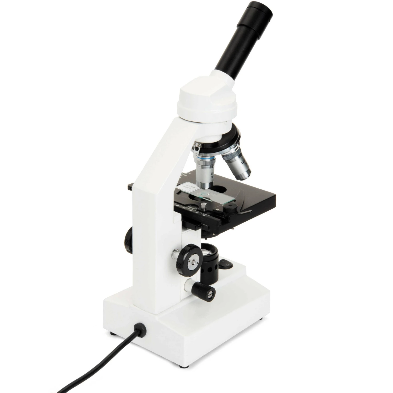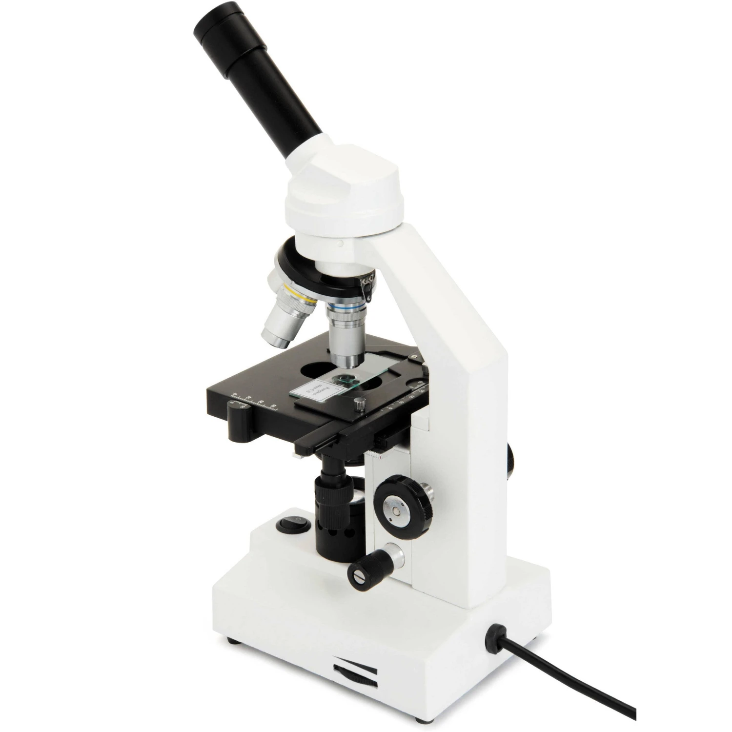 Celestron Lab ‘s CM2000CF Compound Monocular Microscope is ideally suited for students and hobbyists with its 360° rotating head for easy sharing, an eyepiece set at a comfortable 45° angle, and broad magnification range. Its four-position click-stop turret holds the 4x, 10x, 40x, 100x achromatic objectives and the instrument comes with two eyepieces that produce magnifications from a practical 40x to a powerful 2000x.