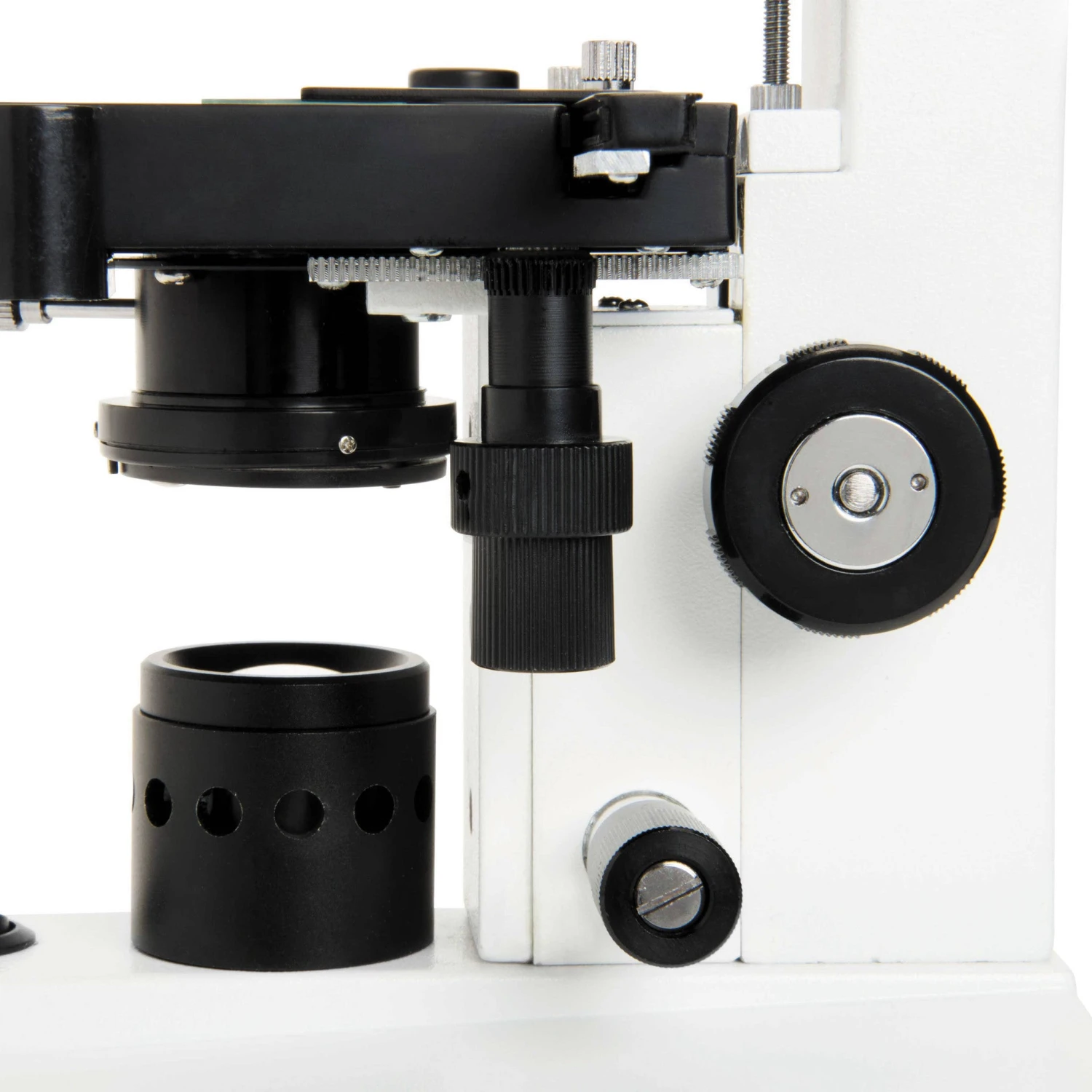 The 4.3 x 4.9″ stage is articulated on the X and Y axes to place the exact area of interest precisely in the center of the stage. An adjustable-intensity halogen bulb under the stage provides the necessary illumination, and the manually adjustable iris and Abbe condenser ensures the perfect amount of light and beam spread to illuminate the specimen without washing it out. Use the coarse and fine focus knobs to bring all specimens into sharp, clean focus.