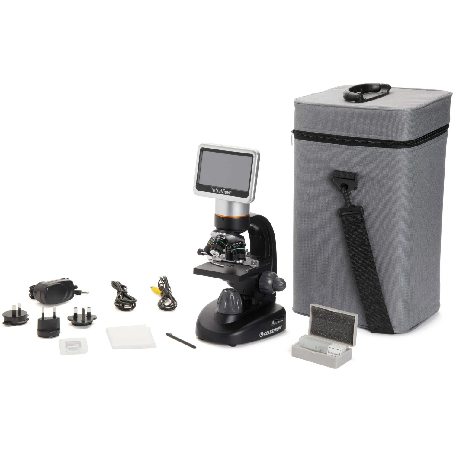 The TETRAVIEW 5MP Digital Microscope with 180° TFT LCD Display from Celestron features a 5MP digital camera, achromatic objectives on a rotating turret, a 180° rotating TFT LCD display, and cordless operation option. The objectives have magnifications 4x, 10x, 20x, and 40x and contain optics made of achromatic glass. The achromatic optical glass reduces color distortions and provides images with a better clarity and detail than plain optical lenses. Instead of an eyepiece, this microscope has a Thin-Film-Transistor (TFT) LCD touchscreen which rotates 180°. This type of LCD improves addressability and contrast. The built-in 5MP digital camera delivers up to 400x on-screen magnification without digital zoom. With the 4x digital zoom, it delivers total magnification of up to 1600x. You can view your specimens via an integrated 4.3″ display, capture images and videos, or save them to external memory. The microscope has an SD card slot which supports up to 32GB of memory. It also features an AV/TV and USB output ports which enable you or your audience to view images or videos on a larger screen. Additionally, the microscope can be used in a cordless operation mode using four AA batteries, but does not have a built-in charger.