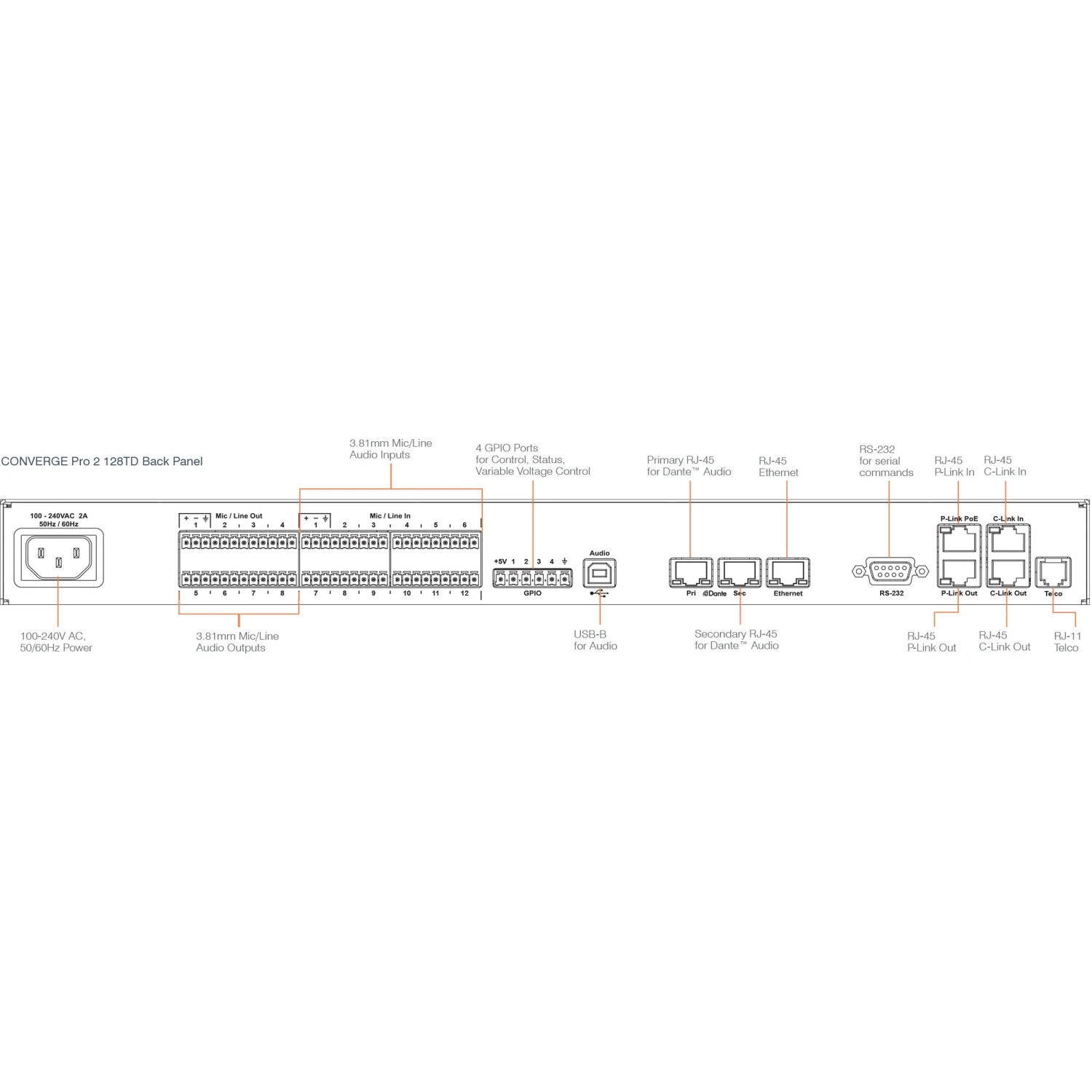| Terminals | (12) x audio line-out / microphone – terminal block (4) x GPIO – terminal block USB – 4 pin USB type B (1) x network – RJ-45 (1) x serial – 9 pin D-Sub (DB-9) (1) x P-Link in – RJ-45 (1) x P-Link out – RJ-45 (1) x C-Link in – RJ-45 (1) x C-Link out – RJ-45 |