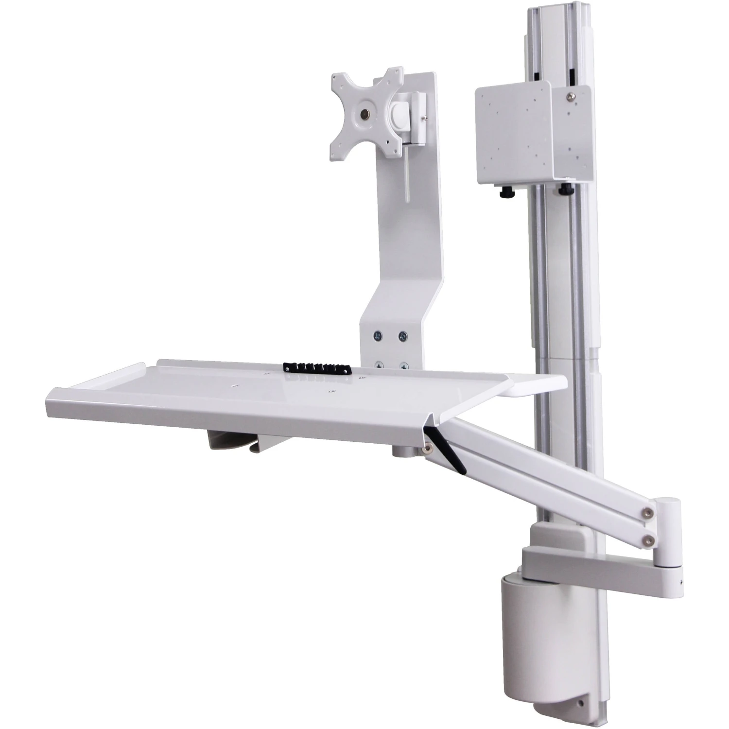 The CTA Digital All-in-One Wall-Mounted Workstation with Computer Cradle, VESA Mount, and Keyboard Tray allows for easy accessibility and stowage. This all-in-one mount holds a computer and keyboard, as well as a 40″ monitor weighing up to 19.84 pounds. The articulating arm allows the display and keyboard to extend up to 40″ from the wall, and the ergonomic keyboard tray allows you to comfortably type while looking at the screen without putting undo stress on your shoulders, neck, or back. When not in use, the entire device folds flush against the wall. This support system was designed for a doctor’s office or anywhere that requires an easily-accessible and reliable sit-to-stand workstation.