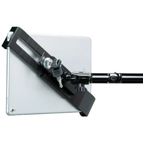 This mount comes with a 360° tablet holder that supports portrait and landscape orientations. It also provides full access to your tablet’s ports, including summarys, cameras, and jacks. Additional parts to this kit include a VESA plate mounting base, two keys, a custom flex arm, and mounting hardware. This security version provides a lock and key design that’s intended to protect your tablet from theft.