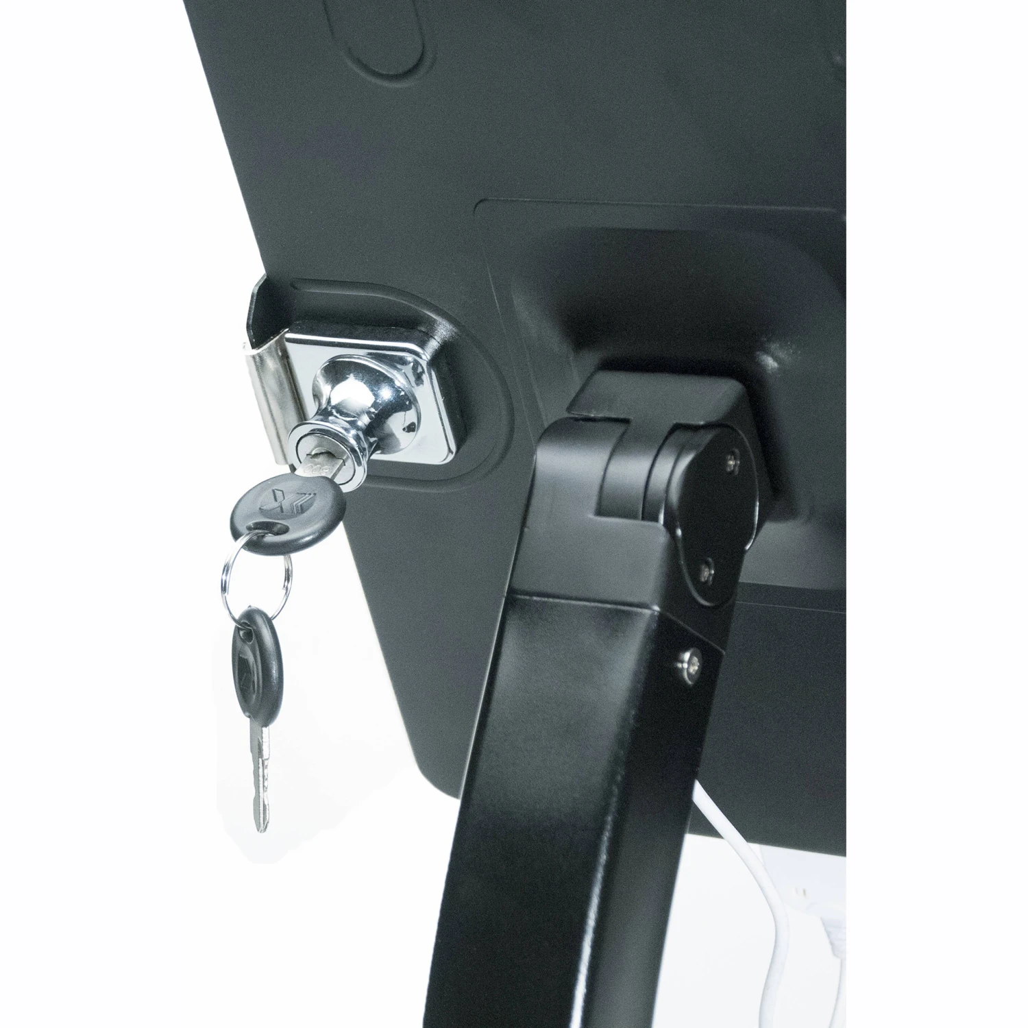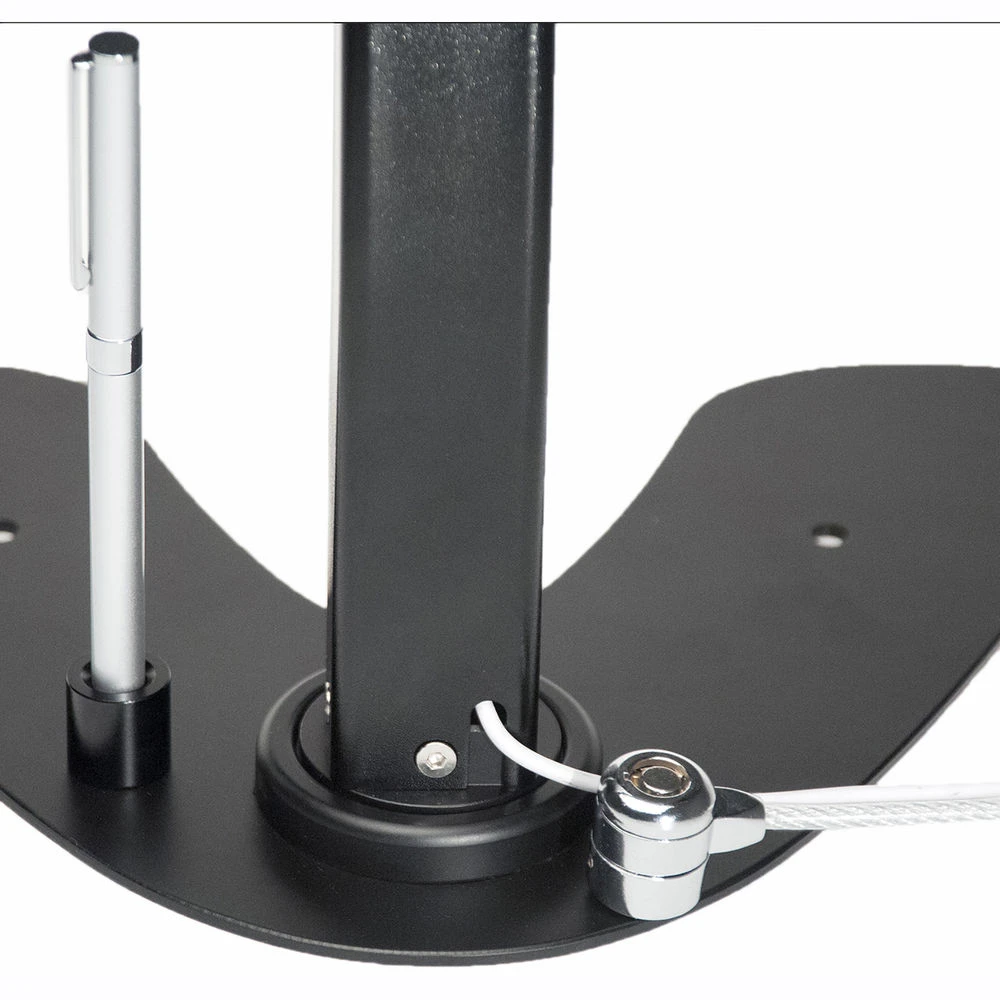The Dual Security Kiosk Stand helps keep your iPad stable on a variety of surfaces, and its pre-drilled holes aid installation on desks or countertops, with the included mounting hardware helping to finalize installations. The stand also helps keep your workspace free of clutter, as it permits cables to routed through it. An all-in-one stylus ballpoint pen is stored in a built-in holder within the case, and the bottom of the case and stand are both padded to help protect your device and furniture.