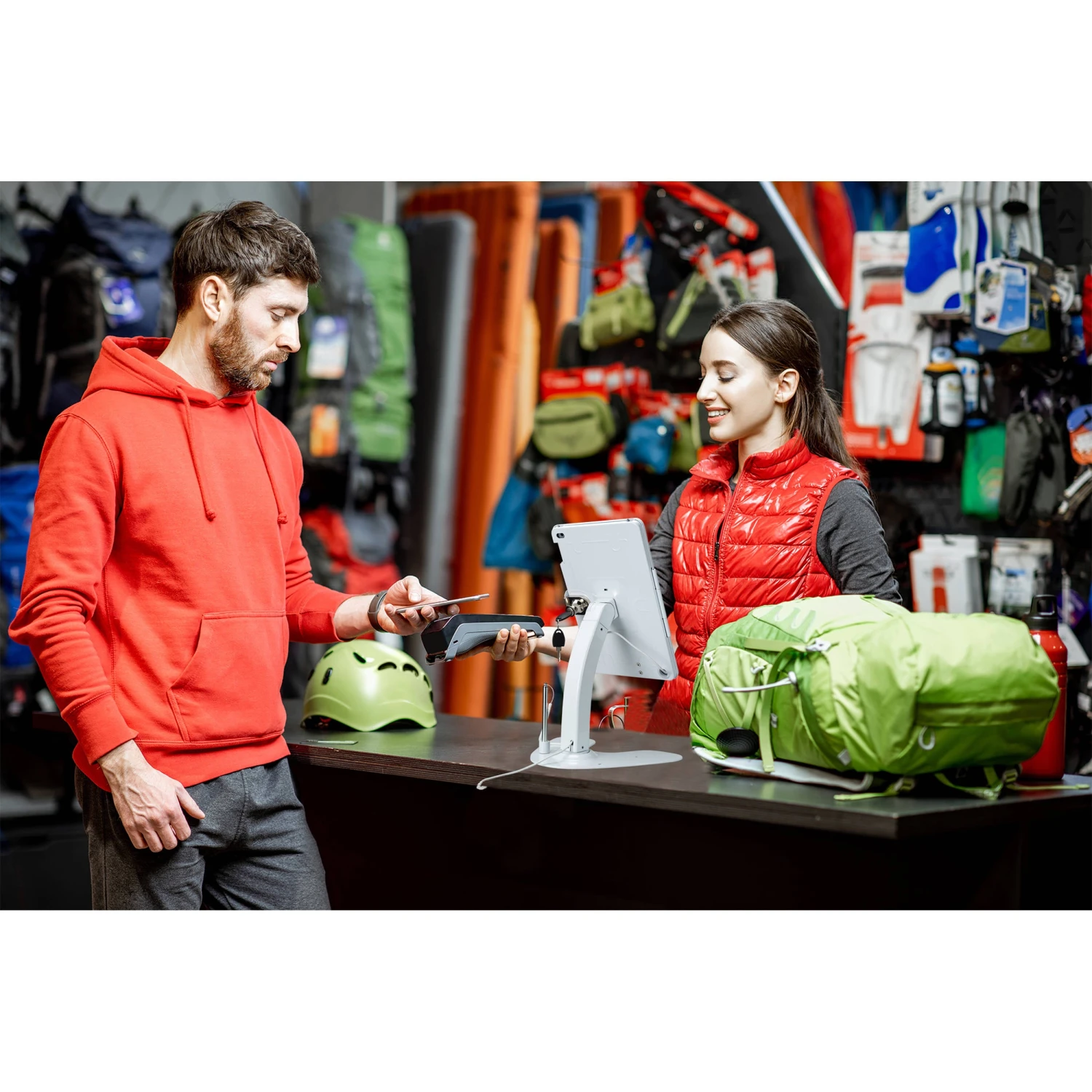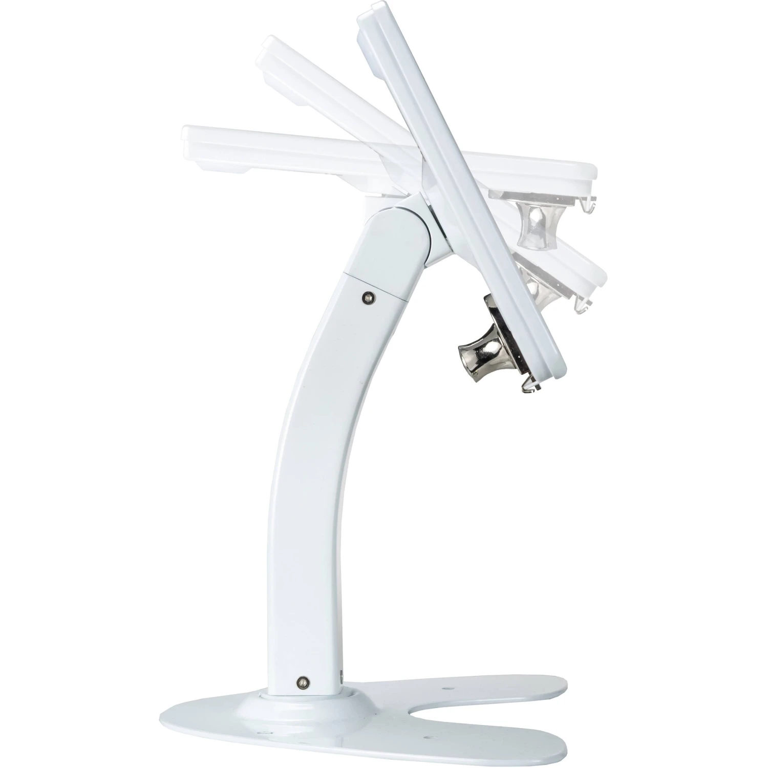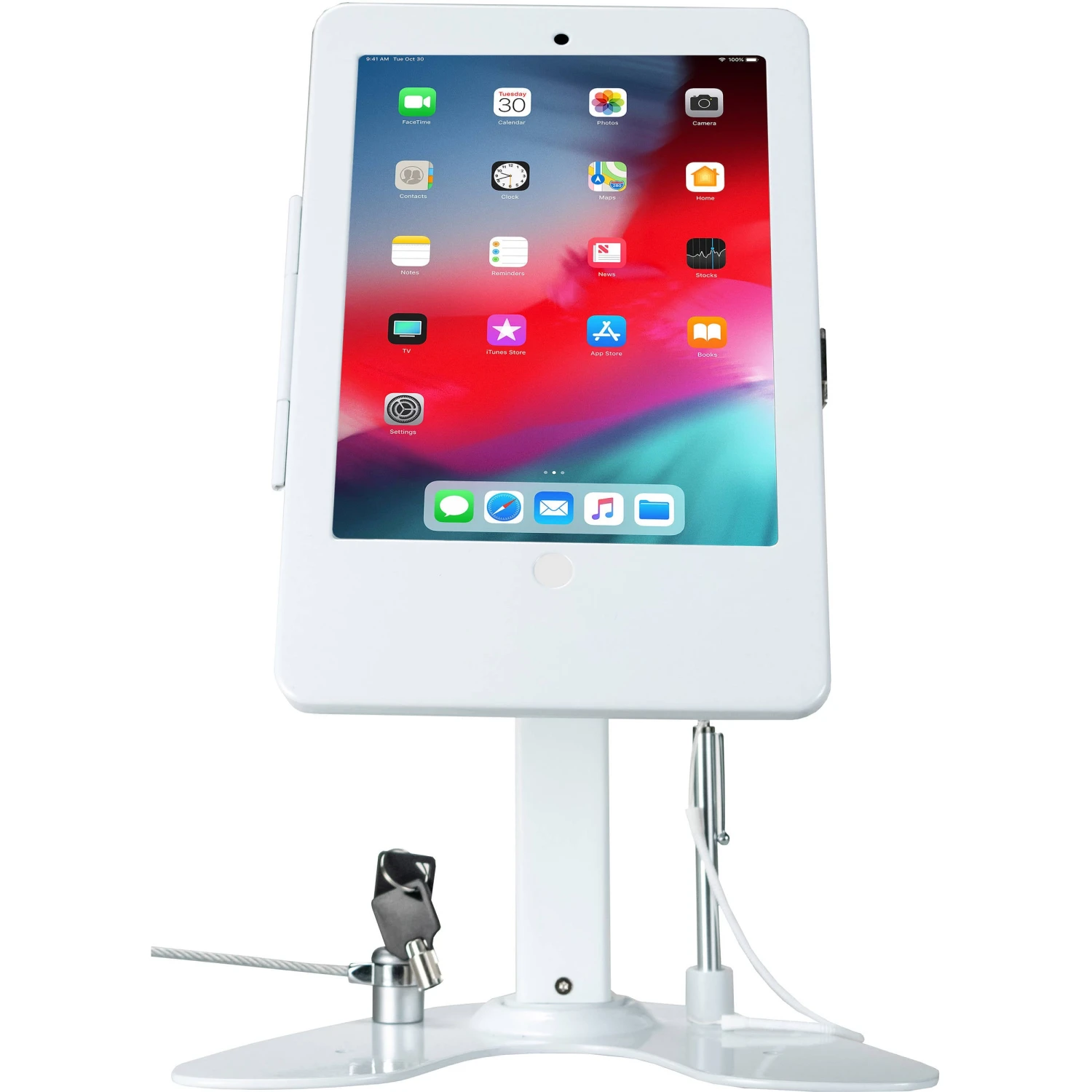 Compatible with the iPad Air, iPad Air 2, iPad Pro 9.7″, and the iPad (5th & 6th generation), the white Dual Security Kiosk Stand with Locking Case and Cable from CTA Digital is a security stand for display, point of sale, and personal use in offices, retail environments, restaurants, schools, tradeshows, and more. Both the stand and aluminum case provide full access to all of the iPad’s ports and summarys, and once mounted to this stand, the iPad can be tilted to adjust the viewing angle, as well as rotated to adjust for horizontal or vertical views. The base also rotates a full 360° to provide an easy transition from register to customer-side transactions, and the case helps prevent theft and locks securely, with two keys being included for case access. To help further protect from theft, an included steel locking cable attaches to either the stand case or the holder, and keys are also included to unlock the cable.