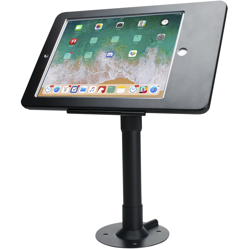 Mount your iPad Pro 9.7″, iPad Gen. 5-6 (2017 and 2018), or iPad Air to a desk or countertop using the Height-Adjustable Tabletop Security Mount from CTA Digital. Once configured, this mount allows users to take advantage of the full functionality of their iPad with access to all ports, summarys, cameras, and jacks. Additionally, the iPad can be rotated atop the pole mount, the enclosure rotates a full 360°, and the height can be adjusted, all allowing your iPad to be used in a variety of environments including conference rooms, classrooms, retail points of sale, and much more.