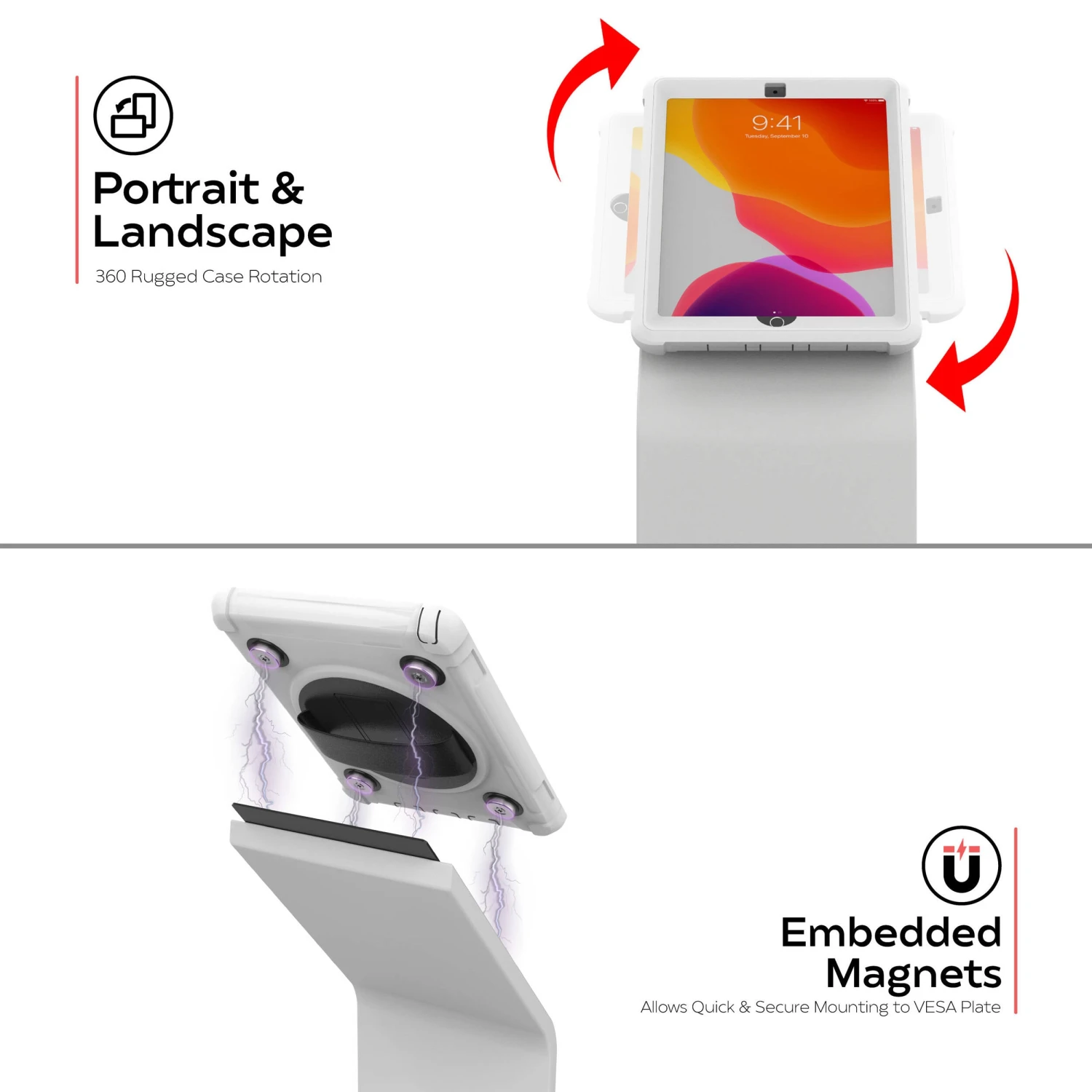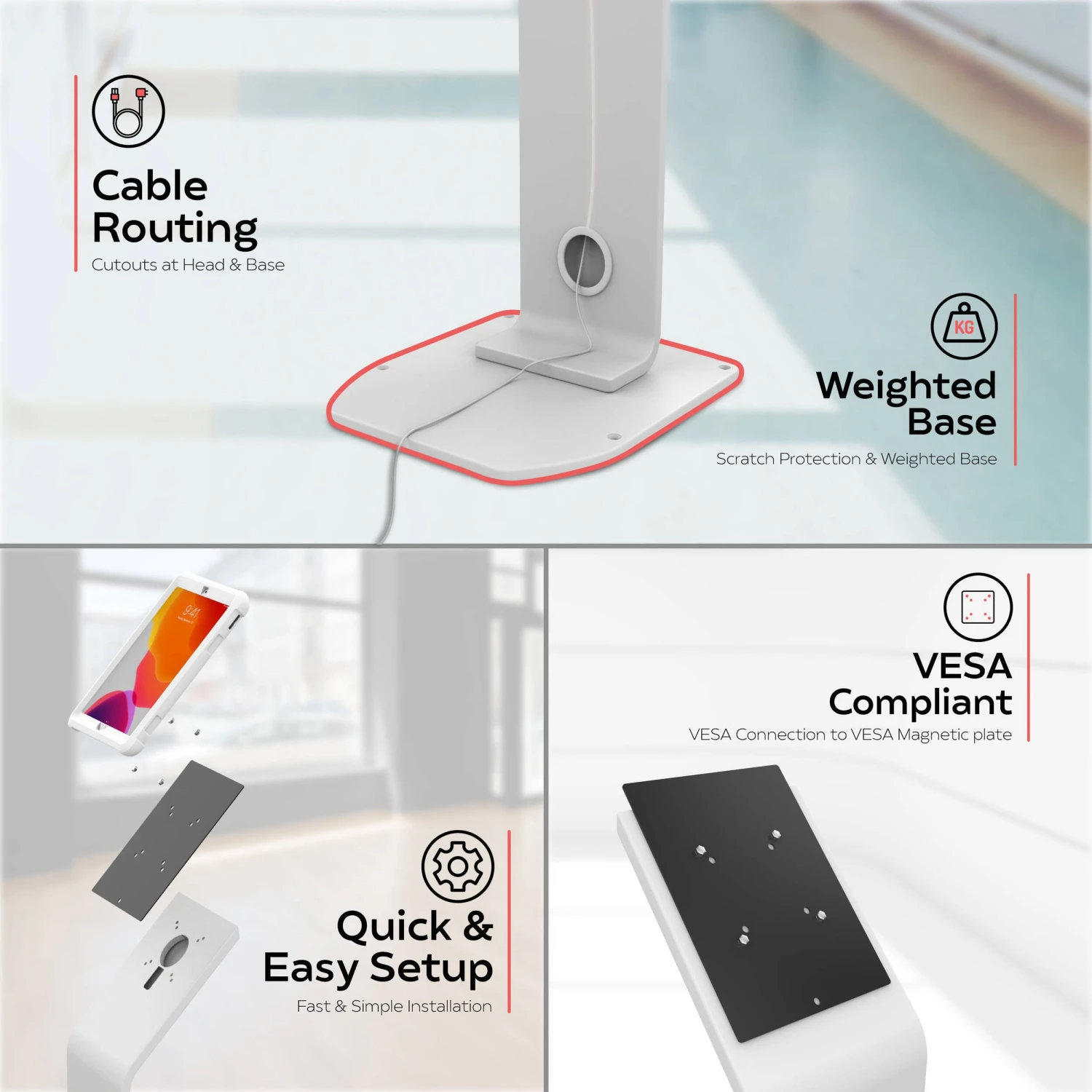 Securely display your iPad with the Locking Floor Stand in white from CTA Digital. A water and impact-resistant silicone case and screen protector provide resilient protection for your iPad, while also allowing for easy cleaning and sanitizing. Additionally, the case preserves access to charging ports, speakers, and the home summary. The removable case also features embedded magnets on the rear panel, allowing you to easily remove the tablet case from the stand and attach it to any metal surface. In addition to a scratch-protected, padded, and weighted base, the durable steel stand sports interior cable routing for easy connectivity.