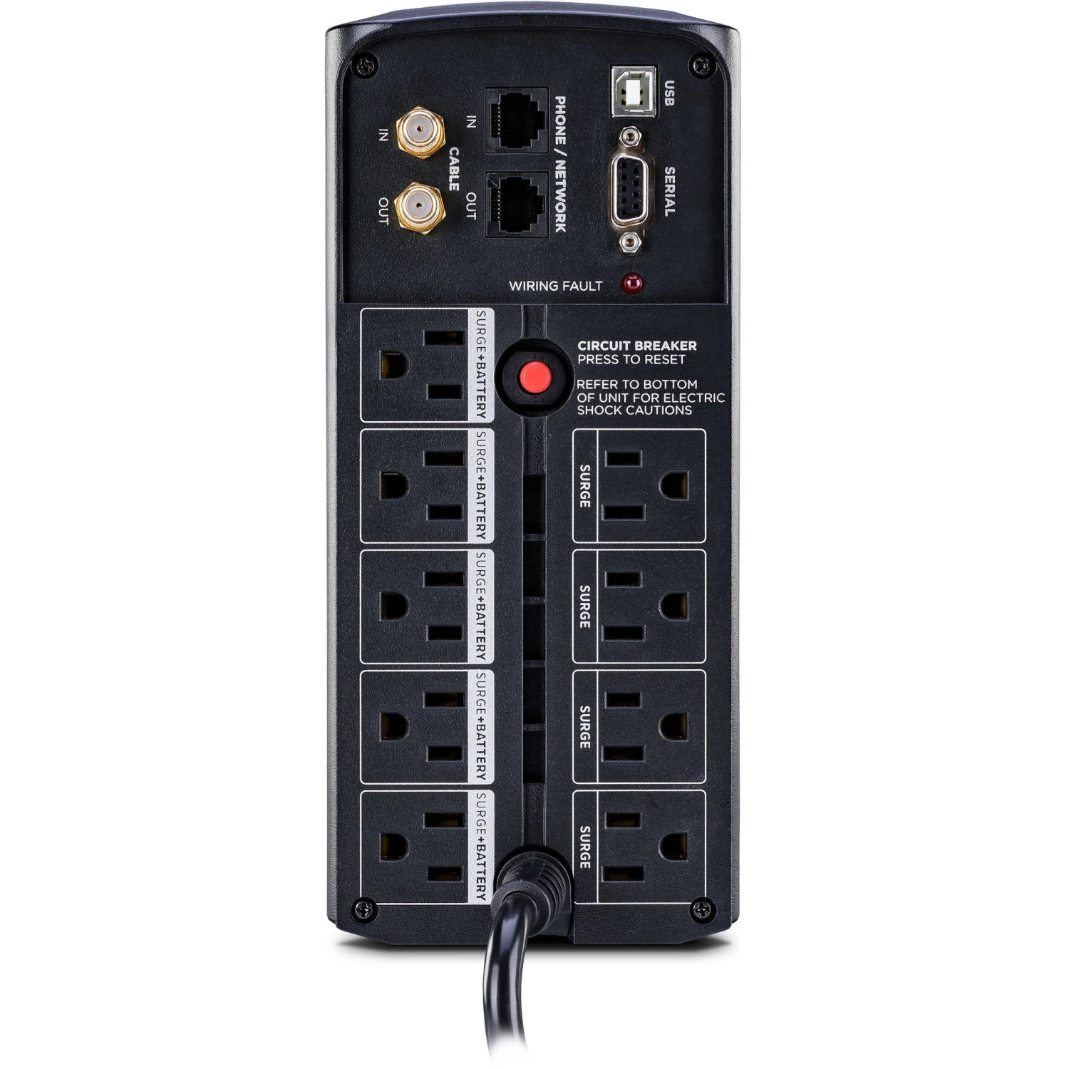 This mini-tower power supply offers nine total outlets that are capable of absorbing up to 1,080 joules for keeping your devices safe against surges and spikes. To keep your devices powered during blackouts and brownouts, five of the NEMA 5-15R outlets are battery and surge protected using internal circuitry limiting and a circuit breaker, while the other four just provide surge protection. Other connections offered are serial, USB Type-B, Ethernet RJ45, Phone RJ11, and Coax RG6 ports.
