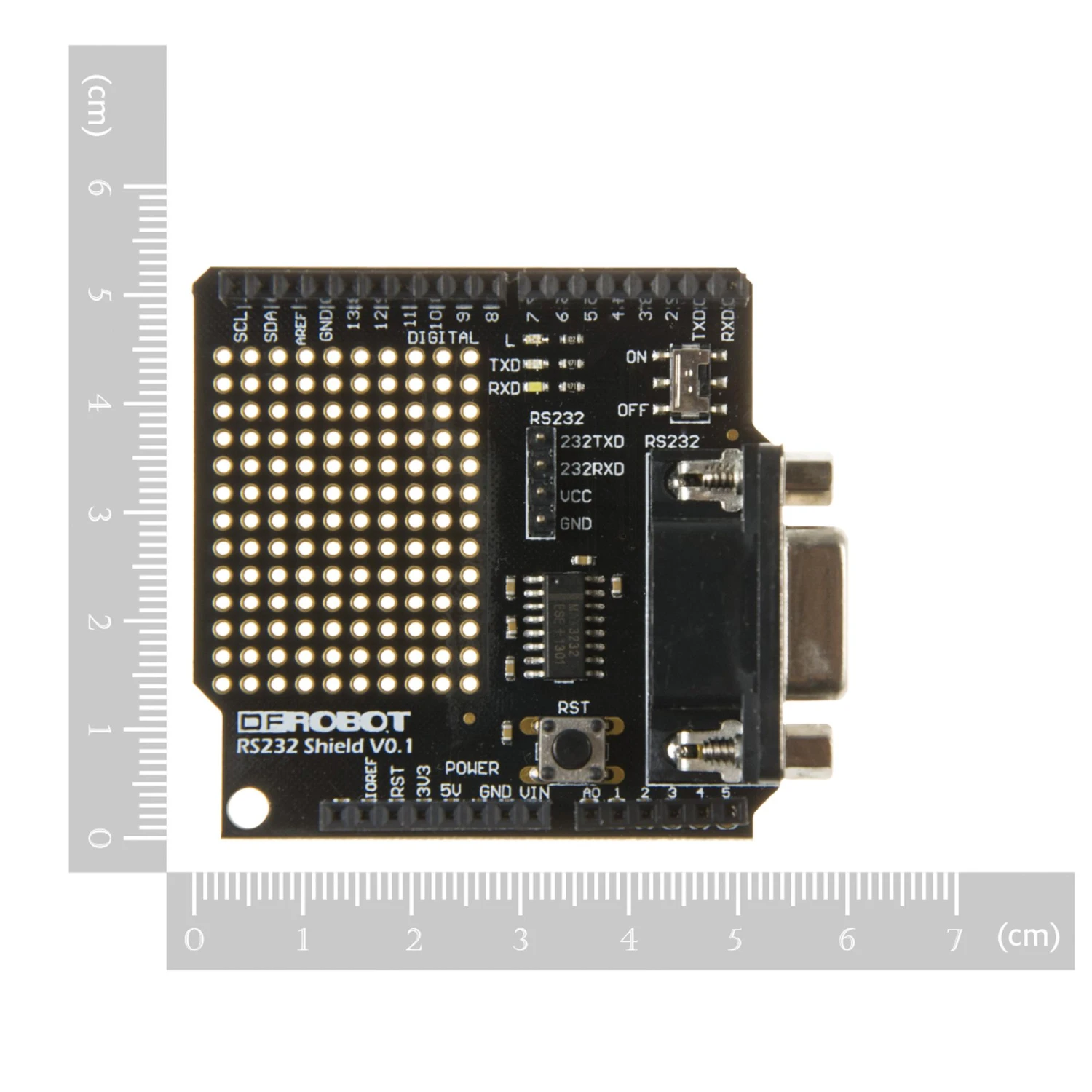 RS232 shield for Arduino is designed for the Arduino controller and it can easily convert UART to RS232 interface. The shield integrates DB9 connectors (female) that provide connection to various devices with RS232 interface. Also the RS232 shield headers will facilitate connections and commissioning. It provides the welding areas to make full use of extra space on it which is highly convenient for prototyping. It provides a run / program mode switch. When switched OFF, users will be able to programme the Arduino controller, when switched ON, they can use the shield normally. Long pins on the back that are compatible with most Arduino controllers such as Arduino Uno, Arduino Mega, Leonardo.