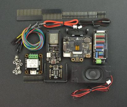Gravity: Huskylens – an easy-to-use AI camera x1, FireBeetle 2 ESP32-E IoT microcontroller with header (supports Wi-Fi & Bluetooth) x1, Gravity: IO shield for FireBeetle 2 (ESP32-E/M0) x1, Gravity: digital 10A relay module x1, Fermion: DFPlayer pro – A mini MP3 player with on-board 128MB storage (breakout) x1, Stereo enclosed speaker – 3W 8ohm x1, Jumper wires 228.6mm F/F (10 pack) x1.