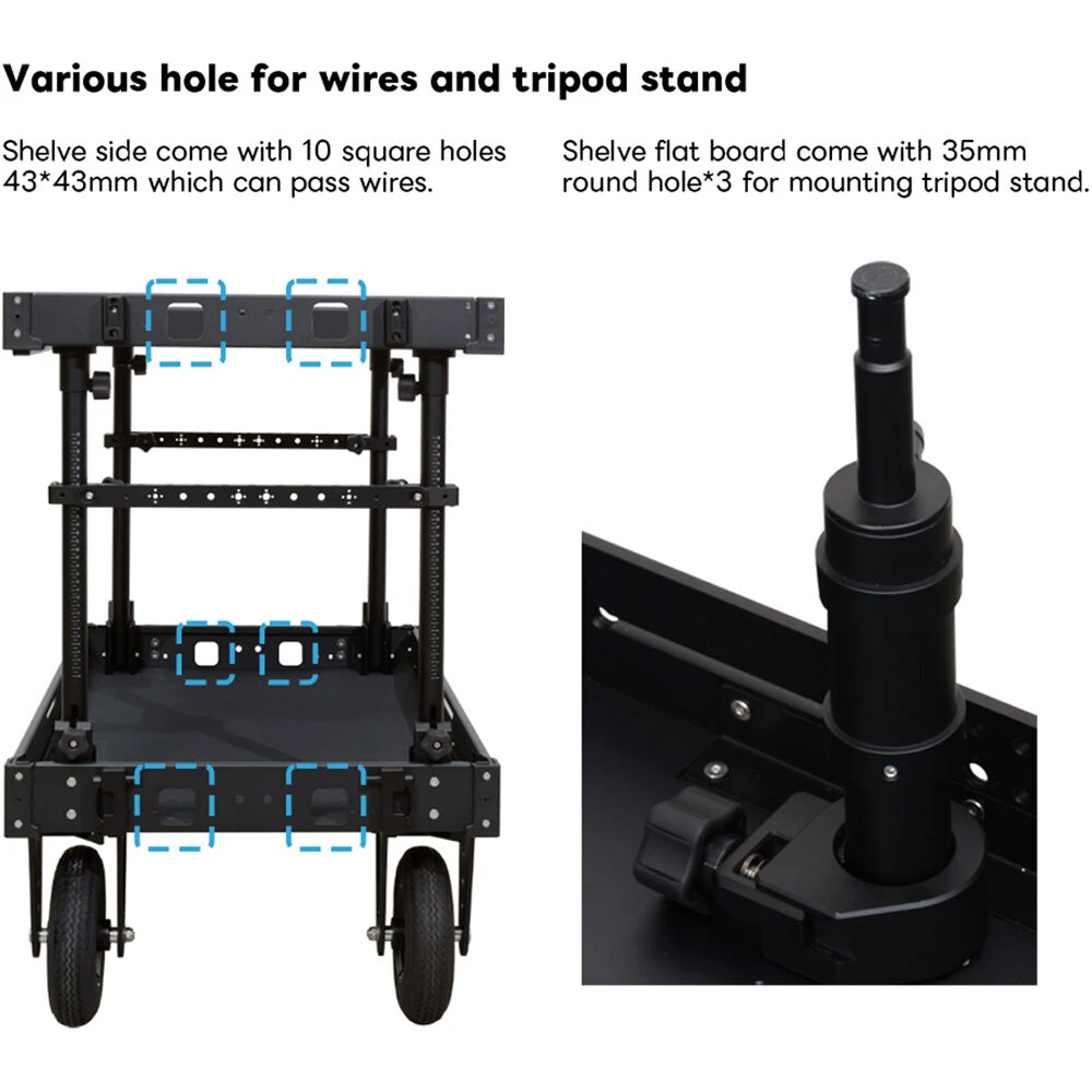 The large DigitalFoto Solution Limited Lightweight Cinemech Video Production Camera Cart‘s working size measures 47.2 x 23.6 x 36.2″. It folds down to just 7″ in thickness. The cart has a 4-sided top shelf, which has a hinged front panel that folds into a flat working surface. The rugged cart can handle up to 771.6 lb.