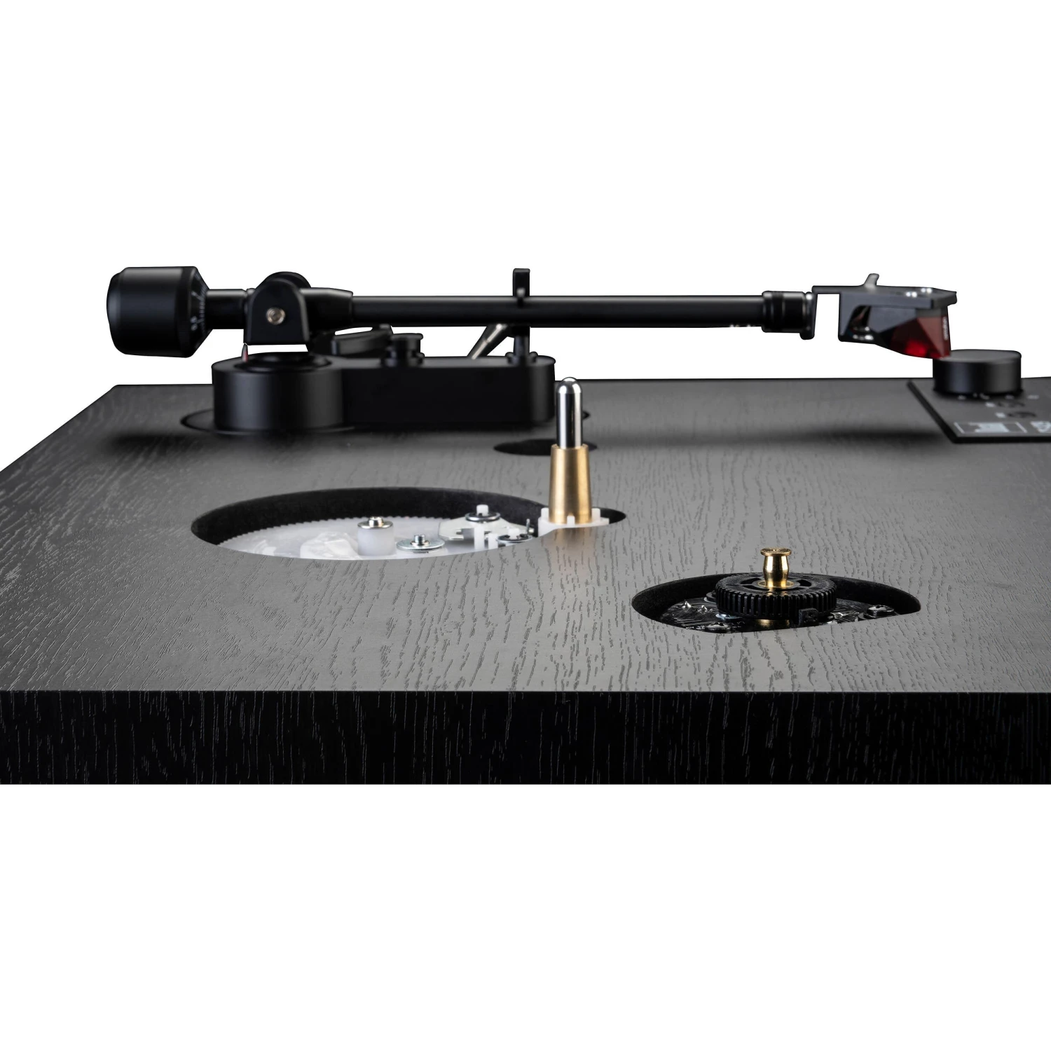 Enjoy your 33 1/3, 45, and 78 rpm vinyl records with your stereo system and the black vinyl veneer Dual Electronics CS 429 Fully Automatic Three-Speed Turntable. It features a die-cast aluminum platter and a solid aluminum tonearm with the Ortofon 2M Red cartridge. The turntable has a stereo RCA output with a ground screw that works with nearly any audio system thanks to its built-in switchable preamp. You can switch between fully automatic or fully manual operation. A hinged dustcover is included as an added convenience.
