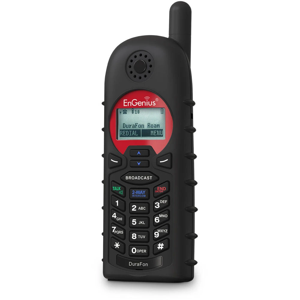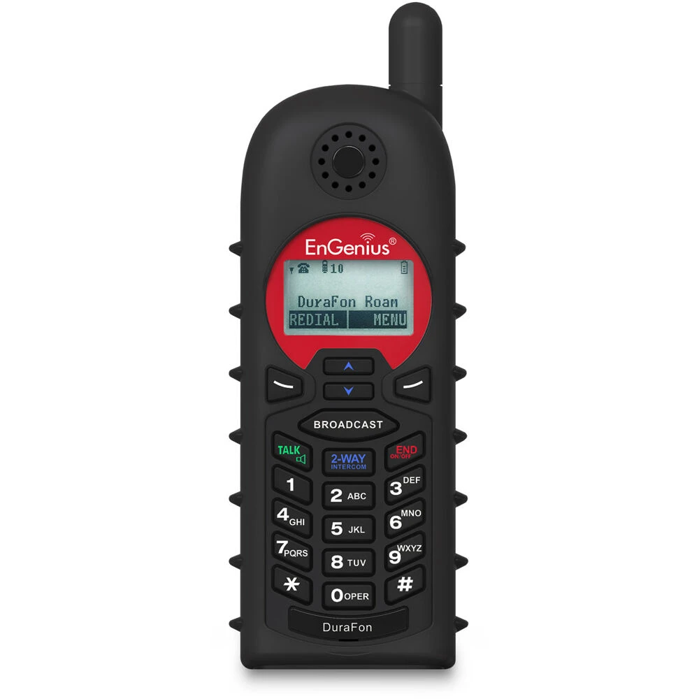 Designed for use in demanding environments such as warehouses, the DuraFon ROAM Handset from EnGenius functions as both a long-range cordless phone and two-way radio. This durable handset operates on the 900 MHz frequency with automatic handoff to separately purchased DuraFon ROAM base station units to ensure clear communications as you move from place to place. Both long-range and low-profiles antennas are included to fit your environment. Its removable battery is designed to provide about six hours of talk time and may be recharged in about three hours.