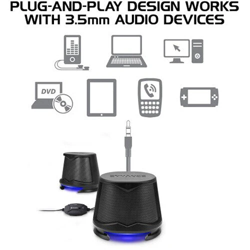 Designed with a modern gamer aesthetic, these speakers use 50mm drivers and 80mm bass radiators to produce up to 10 watts of peak power with frequencies between 100 Hz and 20 kHz, enhancing your overall audio experience. A 3.5mm audio jack connects to your computer while the USB 2.0 cable plugs into any available slot to power the integrated blue LEDs decorated around the base of the speakers. An in-line controller allows you to adjust the volume as well as the LED lighting, giving you total command of your setup.