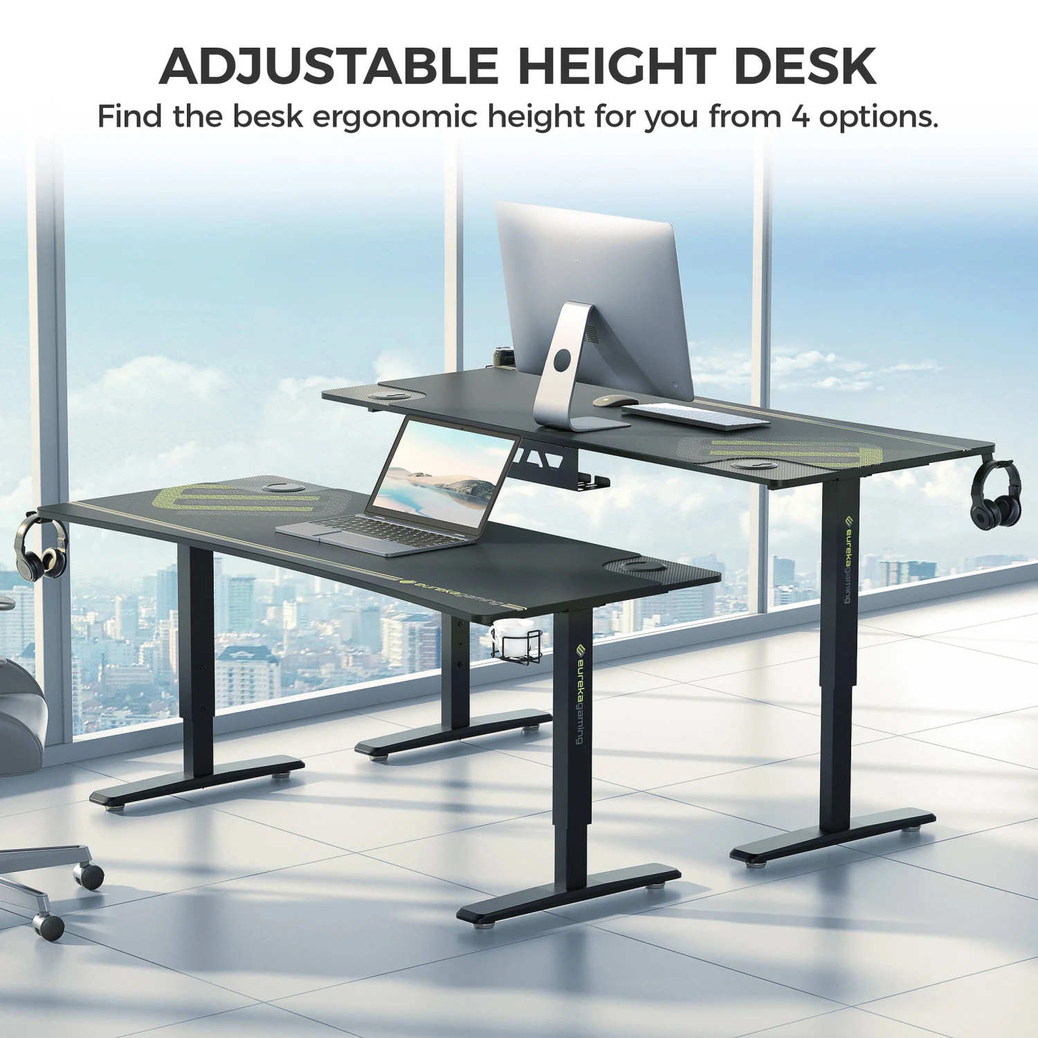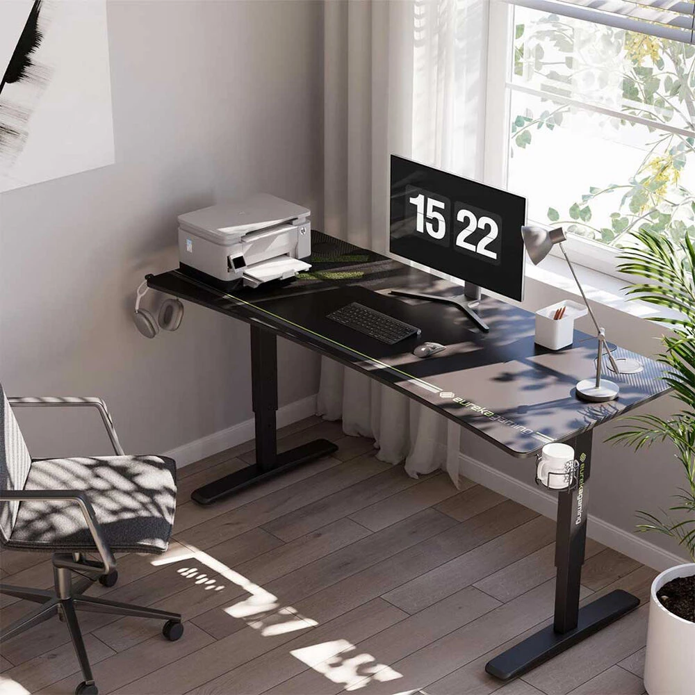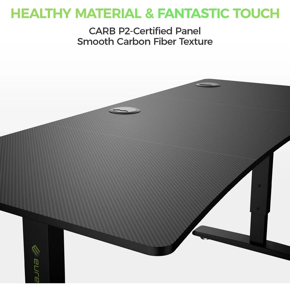 With five levels of height adjustment, the Eureka Manual Height-Adjustable Desk can accommodate the needs of creatives, gamers, and professionals. The curved edge desktop, finished in a carbon fiber wrap, has enough space to support three monitors on its 63 x 26″ surface. The included accessories, such as the full desktop mouse pad and cup holder, are further complemented by the RGB lighting, controller holder, and cable management tray.