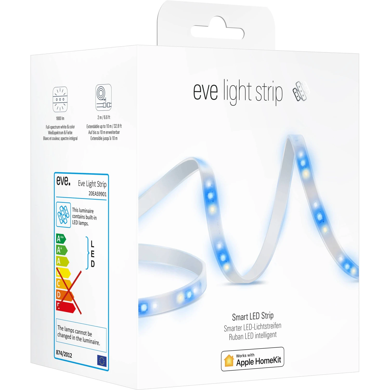 Set the perfect lighting ambiance in your space with the Eve Light Strip from Eve Systems . Delivering an 1800 lumen output, this dimmable LED light strip provides the full spectrum of white and color lighting. HomeKit compatibility offers ease of use, end-to-end data encryption, and Siri voice commands. A bridge is not required for operation thanks to Wi-Fi connectivity.