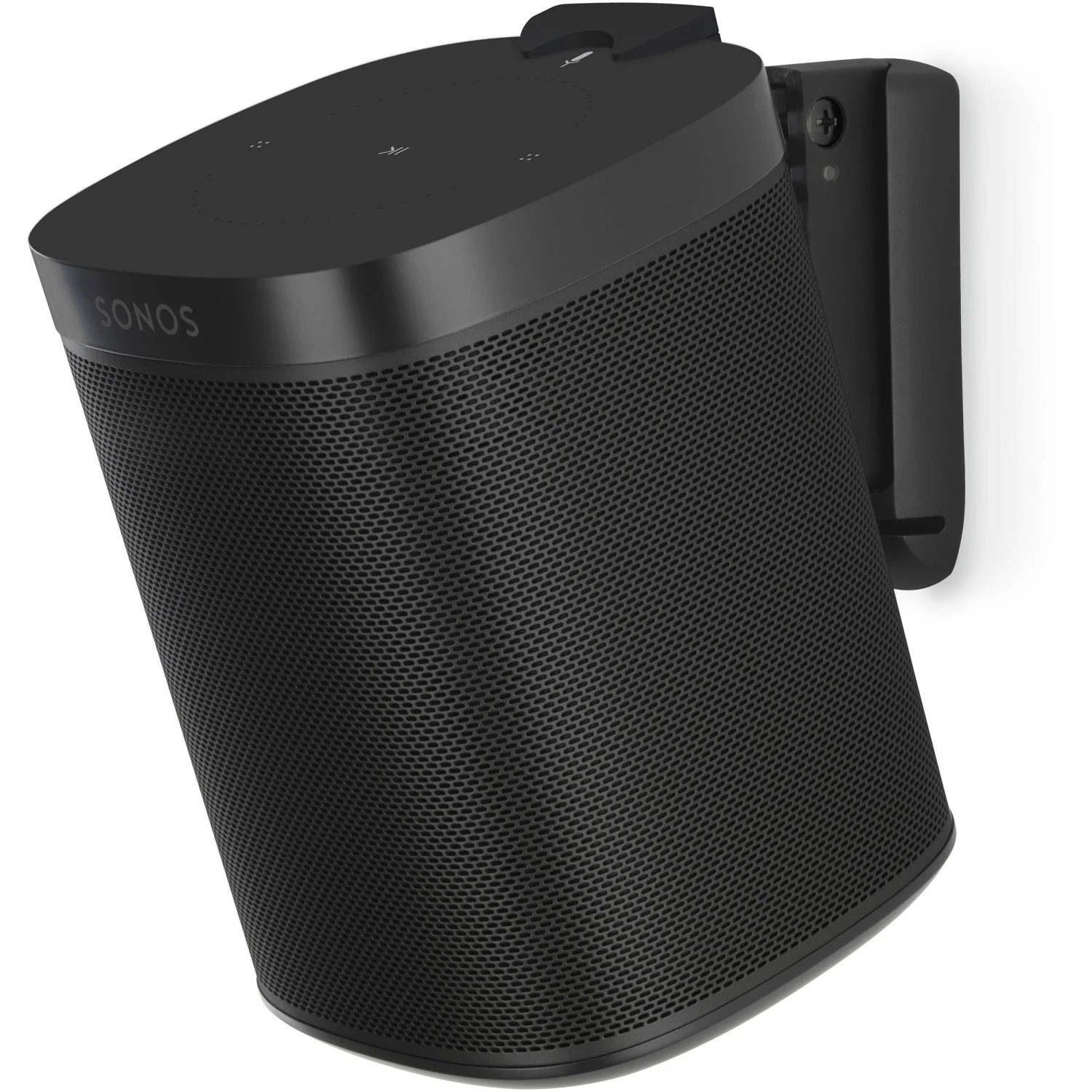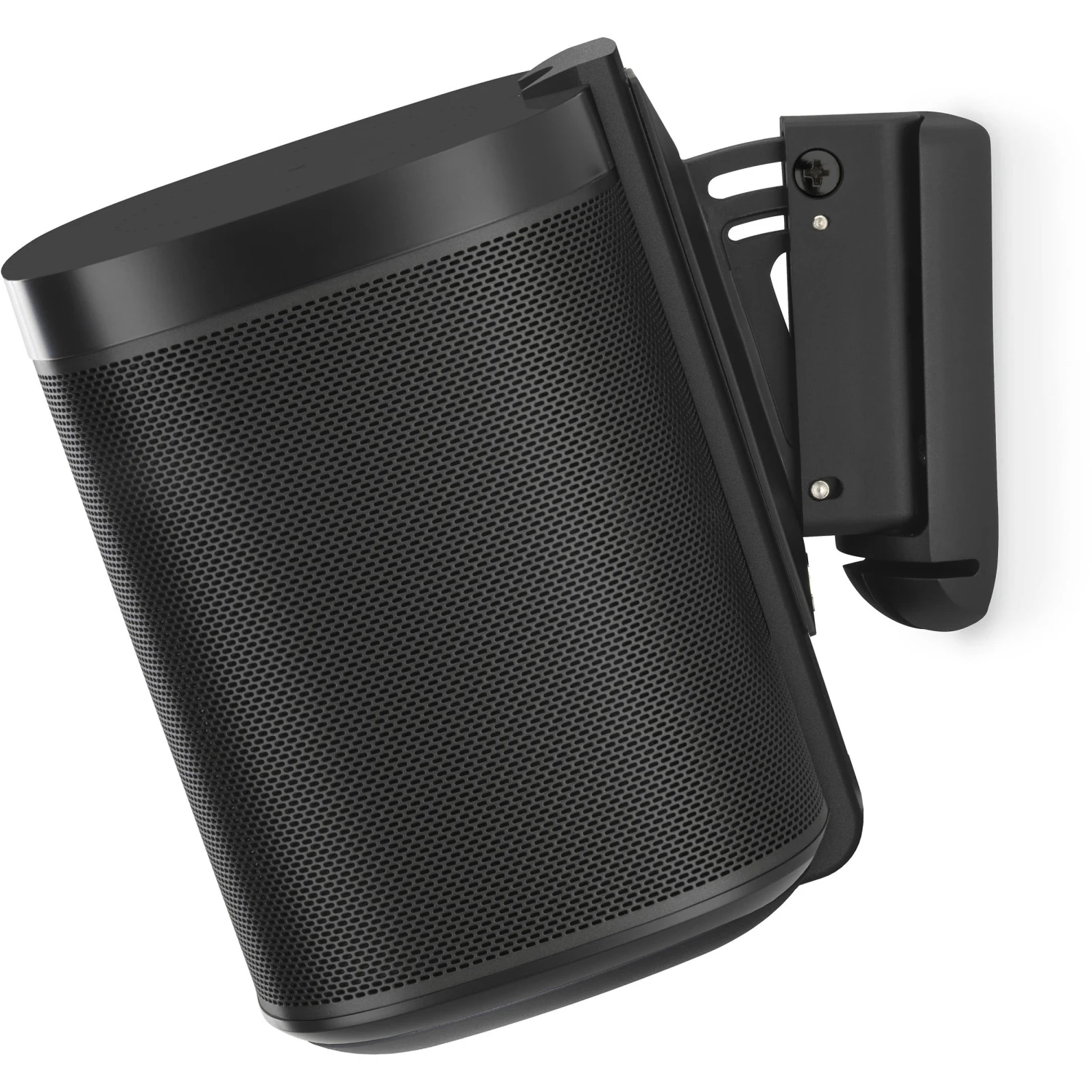 Mount your Sonos One speaker to the wall with the black FLEXSON S1-WM Wall Mount . It tilts 15° downward and swivels left and right up to 40°. The mount can be inverted if you want to install them high on your wall but retain access to the speaker’s touch controls. The black finish is designed to match the finish of your black Sonos One.