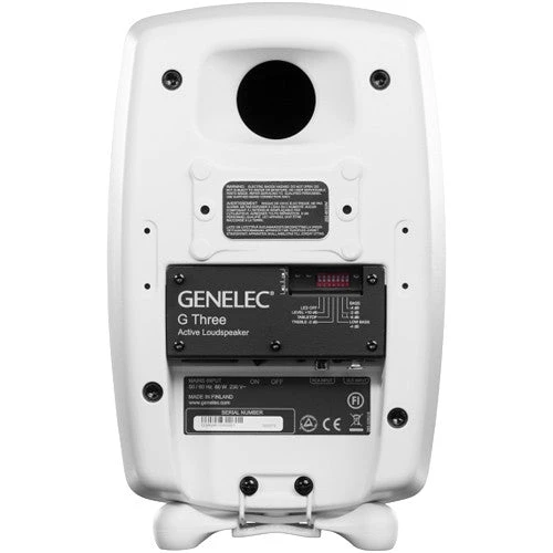 The polar white G Three 2-Way Active Loudspeaker from Genelec is designed to produce broad bandwidth sound with high output and low coloration. The reflex port design helps in reducing the woofer�s displacement, improving the linear low frequency output capacity.