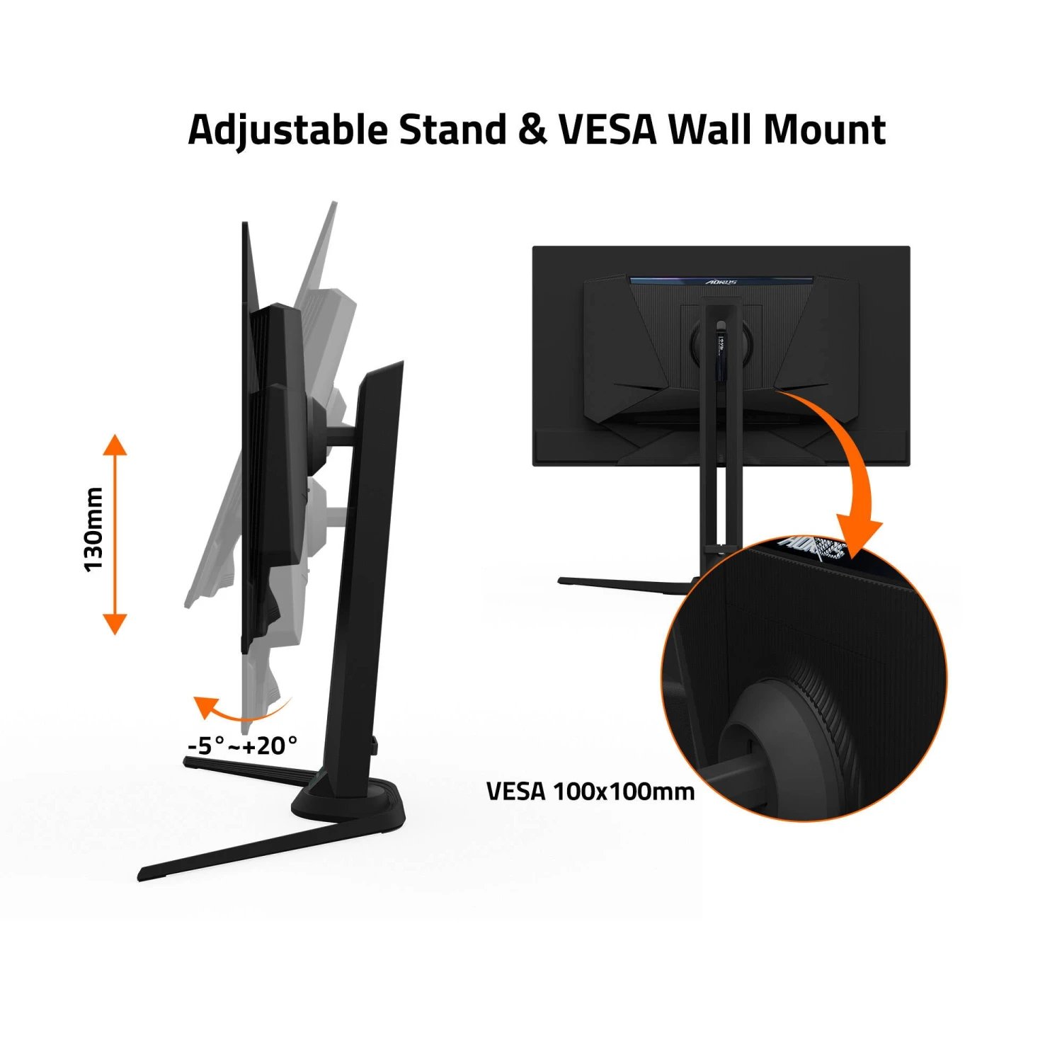 Height: 5.1″ / 130 mm Tilt: -5 to 20° Swivel: -20 to 20° Rotation: 0 to 90° |