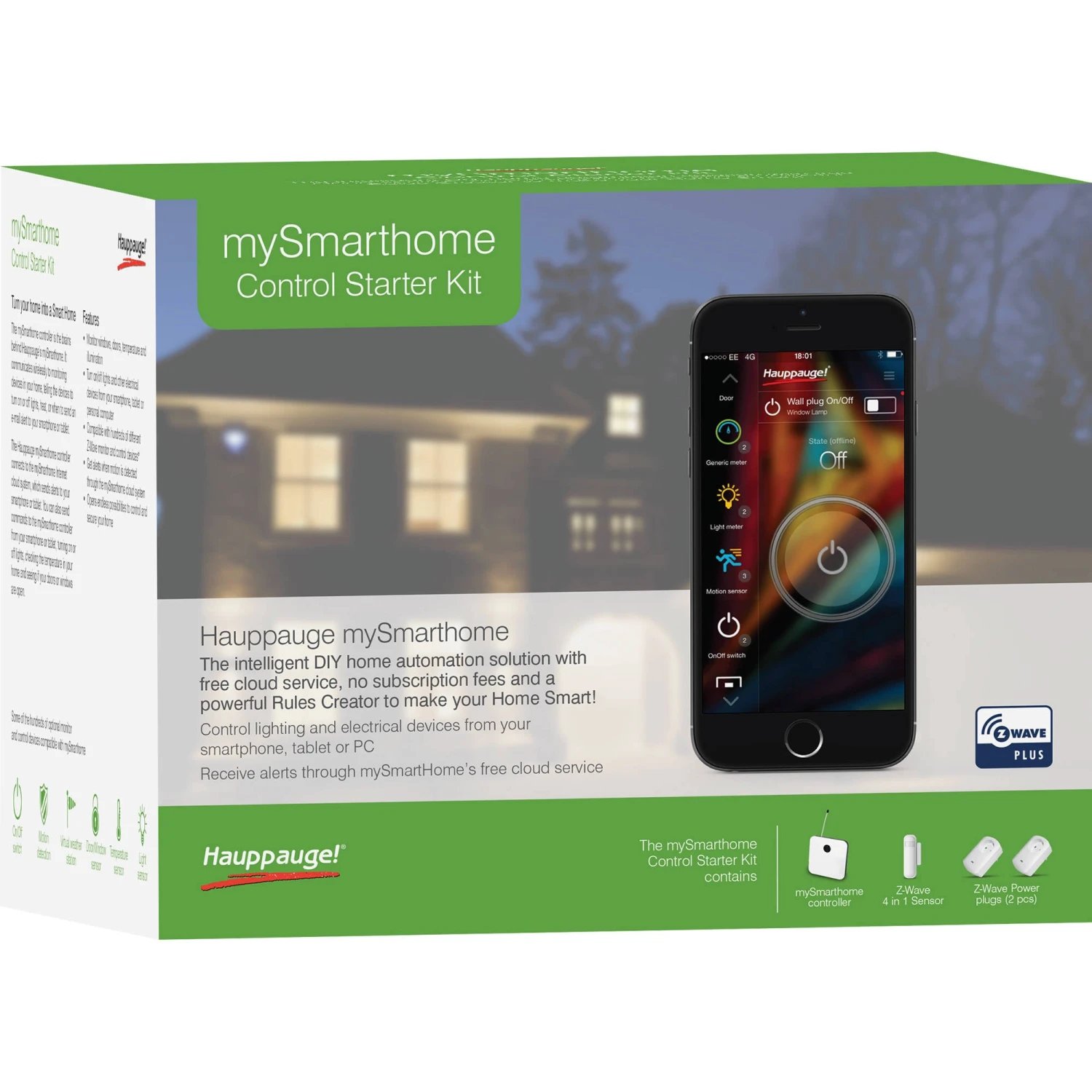 Monitor and control your home with the mySmarthome Control Starter Kit from Hauppauge. This kit comes with 2 plugs, a 4-in-1 sensor, and a controller. The plugs offer 3000W of power control. Additionally, they monitor voltage, current, power, instant power wattage, and accumulated power consumption. The 4-in-1 sensor enables you to monitor temperature, motion, when your doors/windows are opened or closed, and control lights. The sensor is tamper-proof and comes with a battery that has a 2-year lifespan and a low battery indicator.