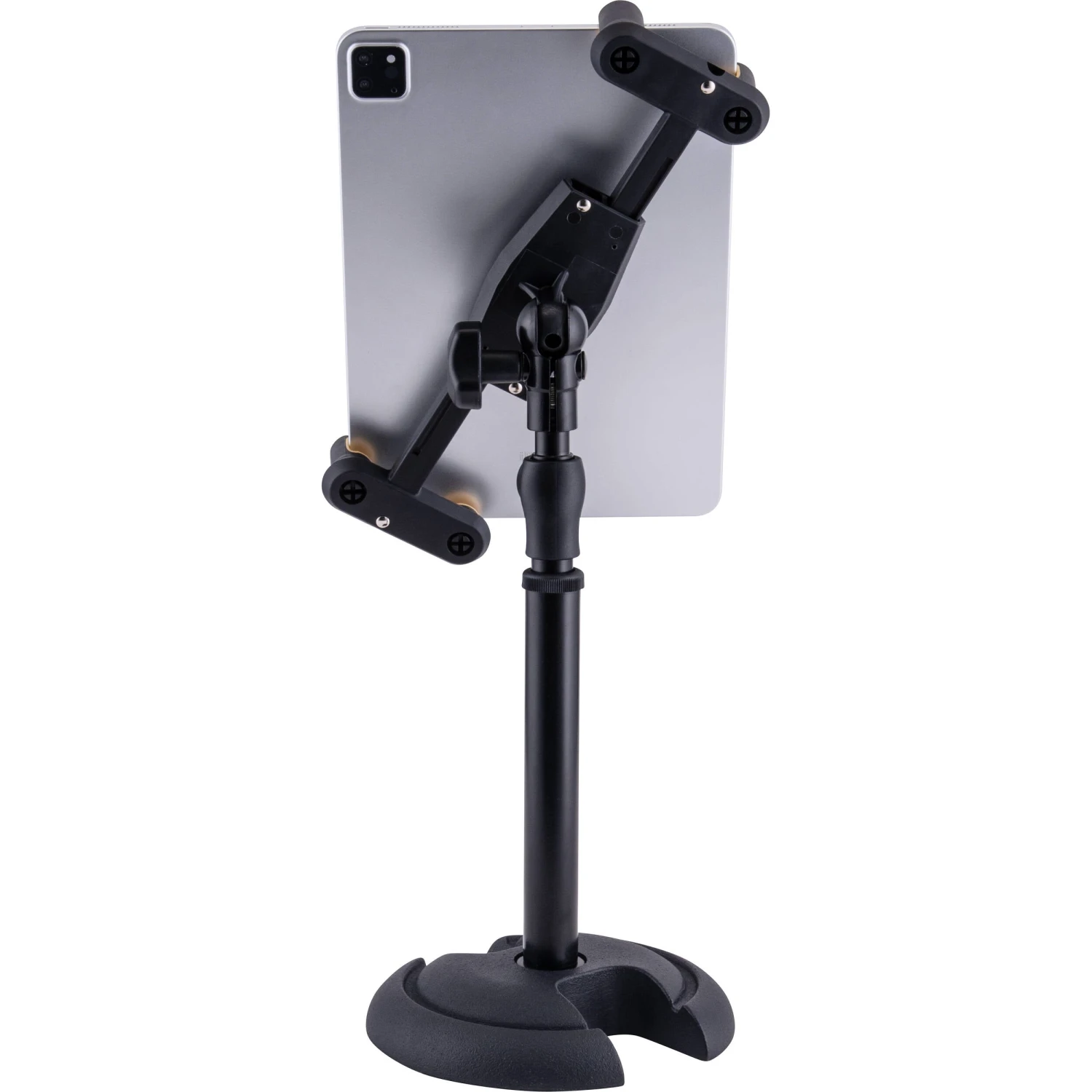 The Tablet and Smartphone Tabletop Stand from Hercules offers unlimited adjustability for positioning smartphones and tablets. It is ideal for positioning tables for musicians, lecturers, photographers, videographers, and other creative professionals. The adjustable clamp has padded surfaces to securely hold most standard sized devices and features a 360° ball joint angle adjustment for precise positioning. It has a reliable weighted base that ensures secure placement of digital devices during various activities, and the Quick-N-EZ adjustment lever provides one-handed height adjustment.