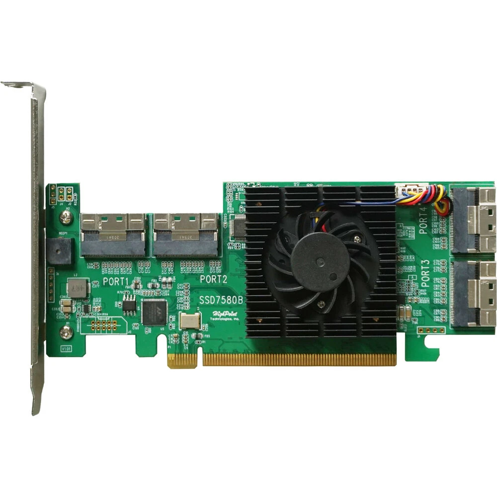Quickly upgrade and enhance your workstation’s storage capacity by installing the SSD7580B U.2 NVMe RAID PCIe 4.0 Host Controller from HighPoint into an available PCIe 4.0 x16 slot. Supporting up to eight internal 2.5″ U.2 NVMe PCIe 4.0 solid-state drives in RAID 0, 1, 10, or Single mode with true hot-swapping support, the SSD7580B is designed to provide both high performance and flexibility. You can connect separately purchased SFF8639, SFF-8643, or SFF-8611 (Oculink) cables with the dual internal drive connectors. This controller also supports M.2 drives if the host system has a compatible backplane. Its anodized aluminum heatsink and fan help to maintain optimal temperatures for high sustained transfer speeds. The SSD7580B also has a low-profile bracket design and is designed to work with Windows 11, Windows Server 2022, and Linux systems with some backward compatibility.