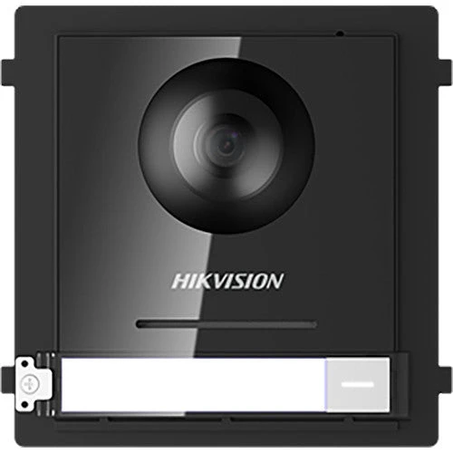 The DS-KD8003-IME1 Video Intercom Module Door Station from Hikvision combines video intercom and access control functionality in one unit. It has a built-in omnidirectional microphone and speaker with noise suppression and echo cancellation for two-way audio. An integrated fisheye camera equipped with a CMOS sensor captures 1920 x 1080 resolution video from a 180° horizontal field of view. An IR supplement provides illumination for low-light conditions.
