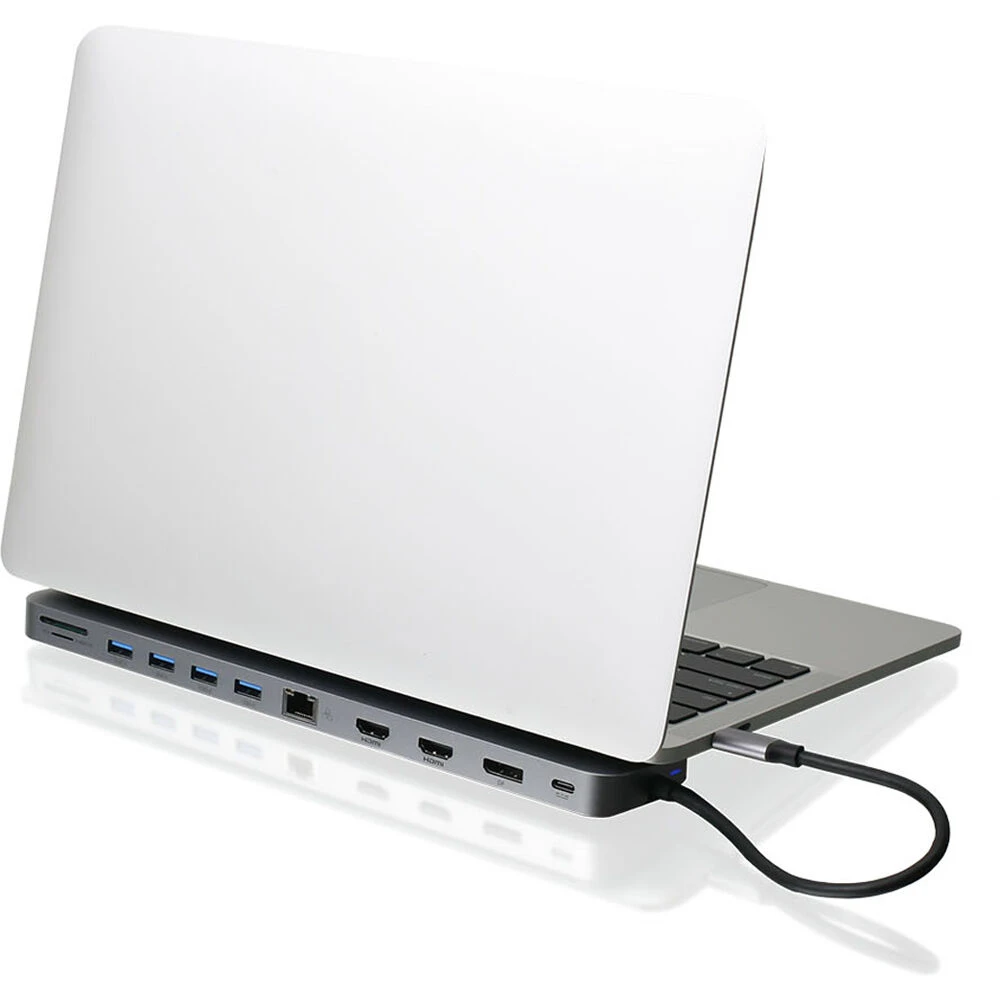 Connect multiple displays, external storage drives, Gigabit Ethernet, and more to a USB Type-C capable laptop with the 13-Port Dock Pro USB Type-C Triple HD Dock with Power Delivery 3.0 from IOGEAR. This dock connects to your host system using an integrated USB Type-C cable and comes equipped with a USB 3.1 Gen 1 Type-C port with up to 100W of Power Delivery, four 5 Gb/s USB Type-A ports, two HDMI ports, a DisplayPort 1.4 port, a Gigabit Ethernet port, a 3.5mm audio and microphone combo port, and an SD and MicroSD card reader.
