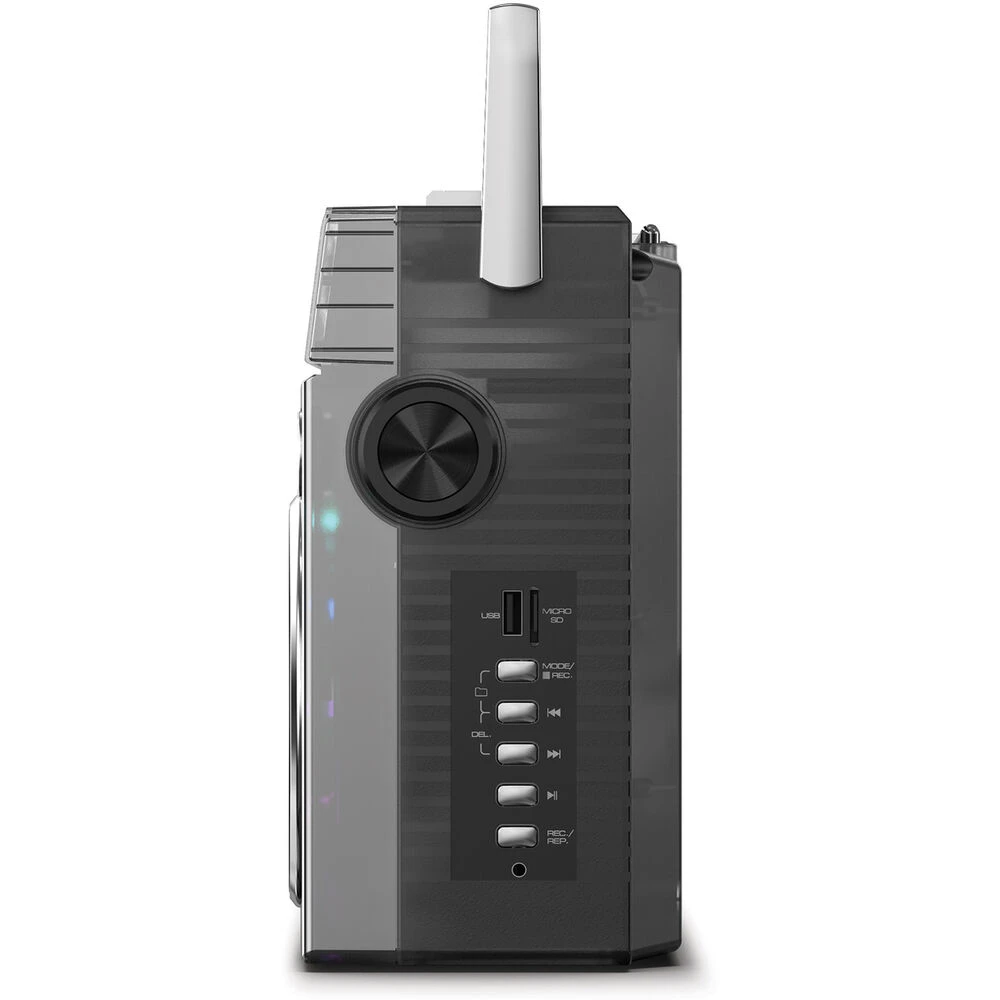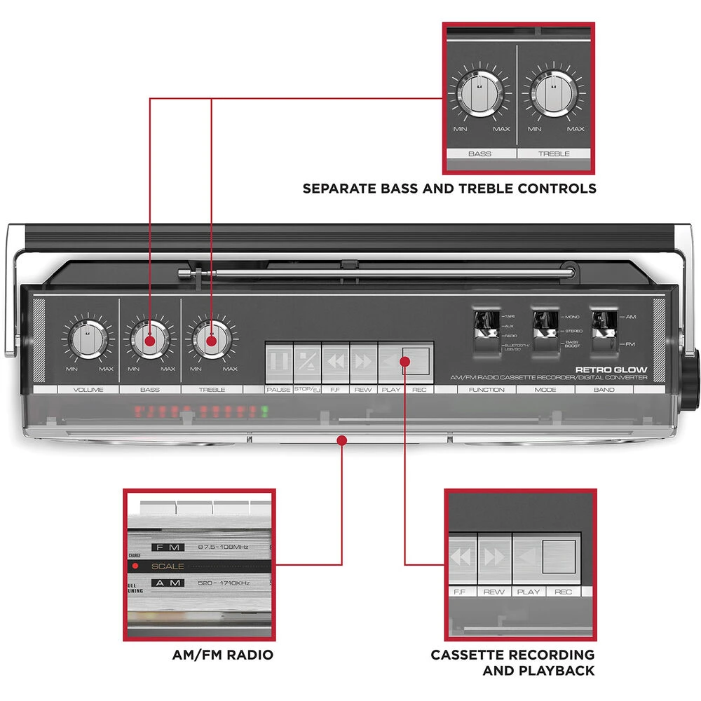 The boombox can play / record onto a cassette, allowing you to enjoy your favorite music from back in the day. You can also stream from your favorite portable device via Bluetooth 5.3. The Retro Glow offers USB and SD inputs for recording and playing back your music files. The Retro Glow includes a 2-pin IEC power / charging cable.