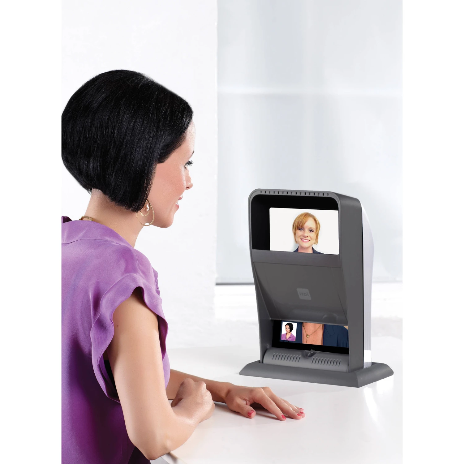 The iTOi Video Studio (1st Generation) is a video booth for iPads that lets you have video chats with natural eye contact. A reflection mirror inside ensures that you look your audience “eye-to-eye” as you speak with them.