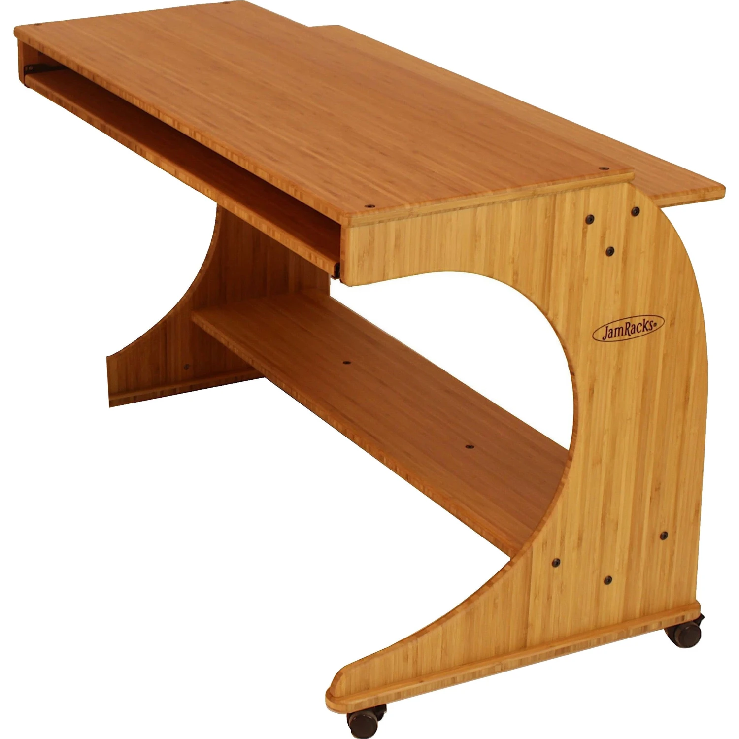 The JamRacks Mini Workstation is a simple workstation for a small space or as a piece of a larger audio workstation setup. This 43″ wide desk has a pull-out tray for a computer keyboard and mouse, and accommodates up to a 61-key electric piano keyboard. Position and settle the desk with the heavy-duty locking casters. A back ledge holds a computer display or speaker monitors. Use the bottom shelf for additional storage. A solid bamboo construction holds up under daily use.