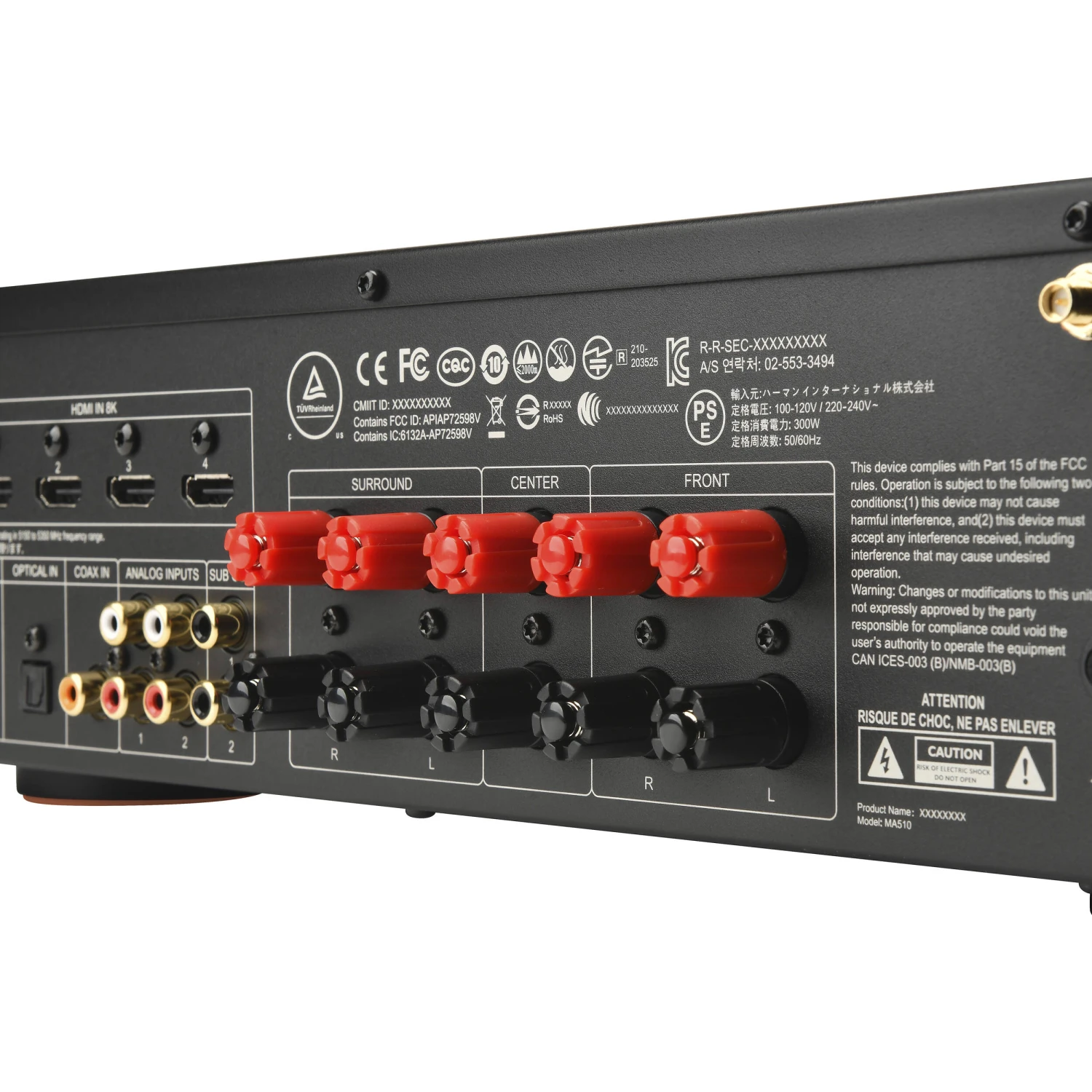 JBL at the heart of your home entertainment center. For movies, the MA7100HP supports multiple speaker configurations, such as 7.2, 7.1, and 5.1.2, thanks to its ability to decode Dolby Atmos and DTS:X soundtracks with object-based positioning. Hook up your Blu-ray player, gaming console, streaming box, and other components to the receiver’s six HDMI inputs, which can output 8K60 or 4K120 resolution. When using the MA7100HP to play music through your system, you can choose from mobile Bluetooth or home network streaming over Gigabit Ethernet or dual-band Wi-Fi. Control it all using the included remote or from the sleek, minimalist control panel with a full-color digital display.