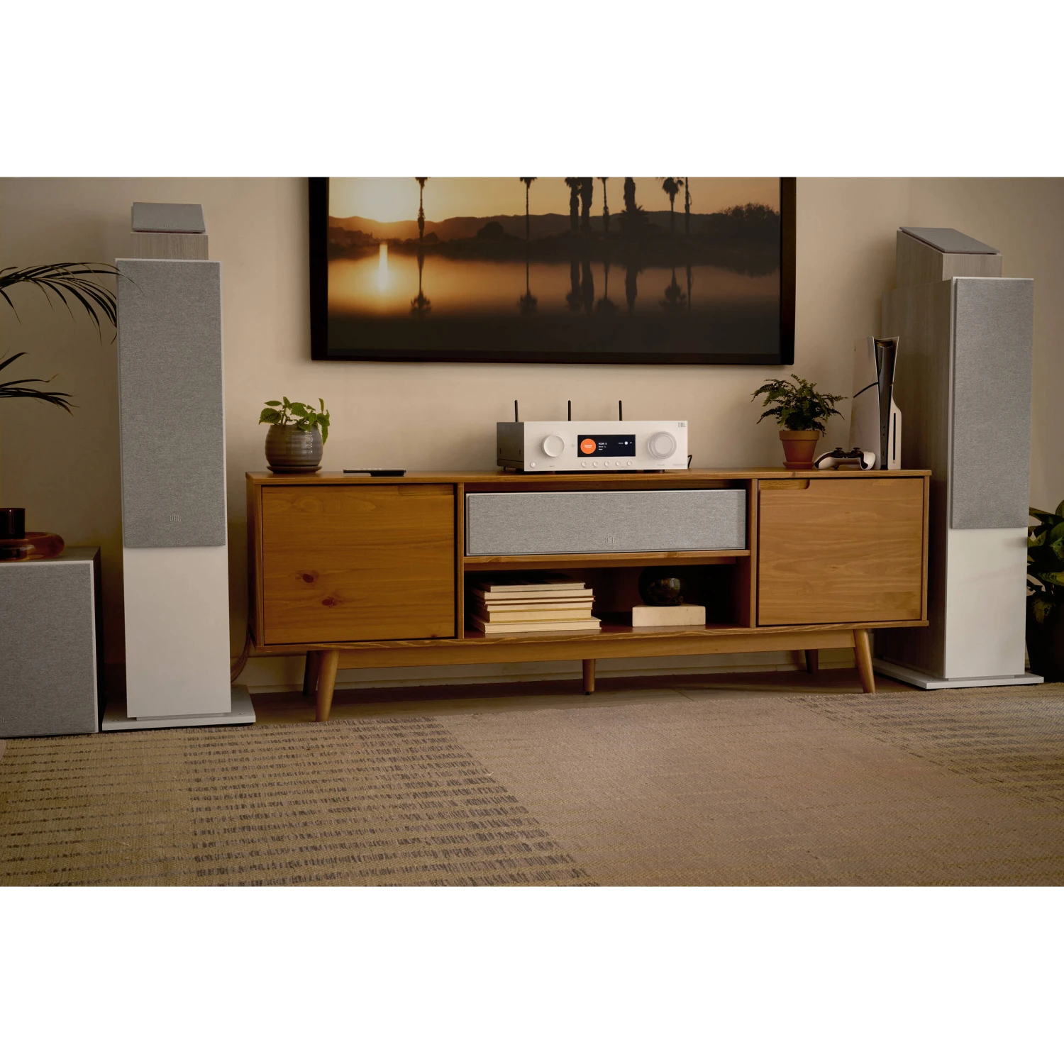 JBL. Cinema fans looking to build a high-end home theater system will appreciate the white-colored MA9100HP’s ability to output at 8K60 and 4K120 resolutions as well as support 9.2-channel audio. With Dolby Atmos and DTS:X decoding, there’s even flexibility for connecting either 7.1.2 or 5.1.4 speaker configurations. Music lovers can stream from almost anywhere, thanks to Bluetooth aptX Adaptive for mobile devices and support for online services via dual-band Wi-Fi or Gigabit Ethernet connectivity. For the gamers in the family, specific technologies are available for achieving smooth frame rates. All of this content can be enjoyed in your theater or living room, or in a secondary location, thanks to Zone 2 audio out and a second HDMI output.