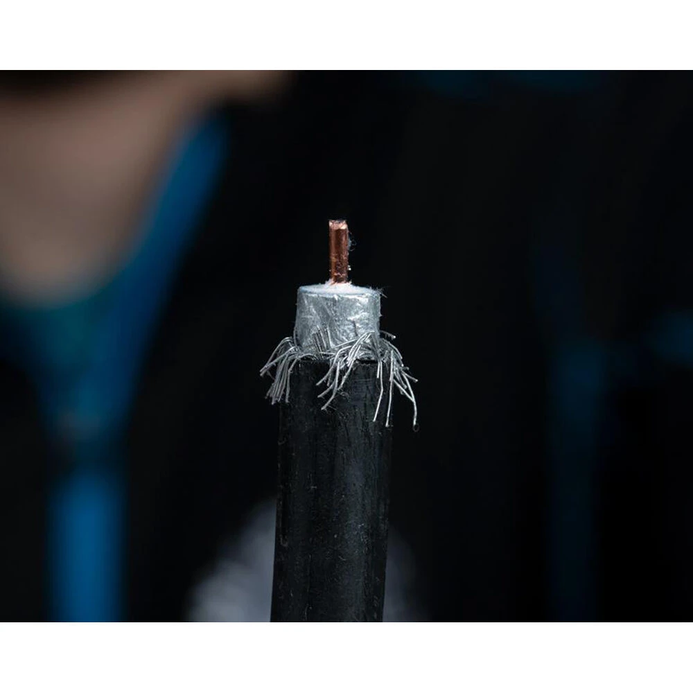 - Stripping action removes 1/4″ of jacket and 5/16″ of shield and dielectric, exposing the center conductor