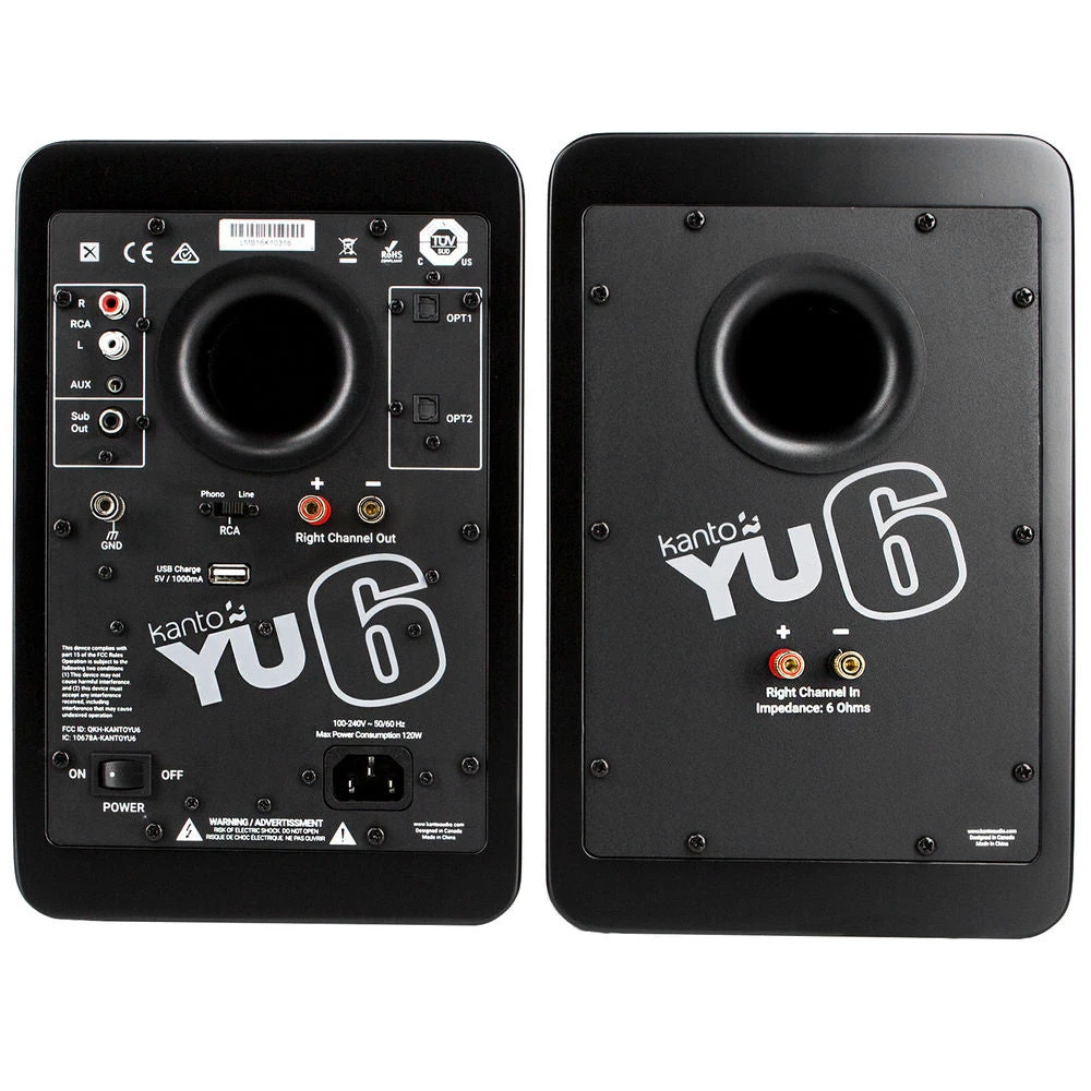 Play audio from nearly any device with the pair of onyx Kanto Living YU6 2-Way Powered Bookshelf Speakers . They feature an RCA, 1/8″ mini, and two optical TOSLINK inputs, plus built-in Bluetooth for wireless connectivity. The RCA input can function as either a line-level or phono input via a rear-mounted switch, and a ground terminal is onboard to attach to your turntable. A 5V USB port is also built-in to keep your phone charged during playback. Each speaker has a 5.25″ Kevlar woofer and a 1″ silk dome tweeter to produce a total RMS output of up to 100W. An IR remote is included, along with speaker wire and an 1/8″ AUX cable for instant connectivity.