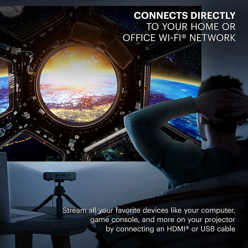 The Luma 400 has a speaker built-in to eliminate the need for external speakers, simplifying its ease of transport and setup. Wi-Fi connectivity lets you stream to the projector from your favorite apps. It also has an onboard HDMI port to connect to a traditional A/V source. You can control the Luma 400 via the Kodak Luma companion app or with the included remote control.