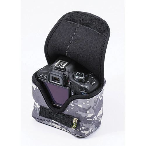 The digital camo finished BodyBag Compact with Grip from LensCoat is a soft, shock-absorbing neoprene cover that protects your DSLR, grip, and lens from scratches and abrasions. In addition, it protects your valuable camera and lens from elements such as dust, dirt, and other contaminants. Its touch-fastened closure assures rapid access and storage of your gear. Using this cover also helps maintain the resale value of your camera. It is designed to fit camera bodies that measure approximately 5 x 5.7 x 2″. The Digital Camo is an advanced computer generated camouflage pattern. It is modeled after the U.S. Army’s standard-issue ACU pattern, which provides a pixelated pattern that maximizes visual breakup. The pattern, constructed from small rectangular pixels of color, mimics naturally occurring dappled textures and rough boundaries.