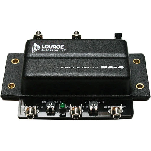 The Louroe Electronics DA-4 Audio Distribution Amplifier features 1 audio input and 4 audio outputs. It receives line level audio signals from the Louroe microphone and distributes it to up to 4 sources such as VCR, DVR, CCTV monitors with amplifiers, or other audio devices that accept line level input (0 dB @ 600?). Each output has a gain adjust potentiometer for correcting the audio level. Maximum gain when potentiometer is fully engaged is 15 dB.