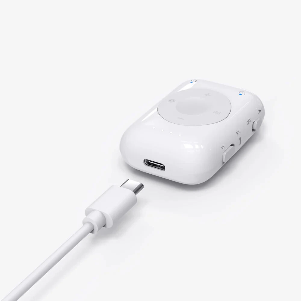 The Connect Air Pro streams audio to up to two pairs of Bluetooth headphones or speakers, simultaneously. The device includes a built-in microphone and remote for hands-free calling and controls for phone calls, media, and volume. The built-in rechargeable battery provides up to 15 hours of playback and charges in 2 hours. The AF-CA2 ships with a 3.5mm audio cable, a USB-A to USB-C cable, and a 2-prong adapter for international flights.
